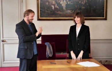 Camille de Toledo, Valérie Dreville et Guy Cassiers réuni·e·s au Théâtre Vidy-Lausanne en mai 2025 © Chloé Cohen