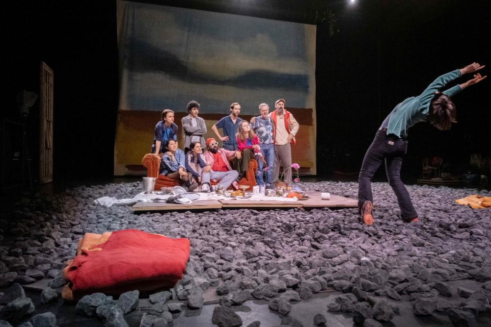 Ce substrat filmique dont ils ont extrait scène par scène les dialogues, l’ensemble des comédiennes et comédiens réunis par tg STAN le suivent à la trace, presque à la lettre. Ils rejouent l’ensemble de ses passages obligés, sans en faire leur propre miel, et s’exposent alors à une comparaison frontale avec l’oeuvre d’origine. Or, à l’épreuve des planches, les différentes scènes paraissent se succéder avec un côté curieusement artificiel, et ne se déploient pas suffisamment pour atteindre le degré de subtilité nécessaire – Elly est, par exemple, dépourvue de tout côté énigmatique et insaisissable, et de tout caractère dual – et dessiner, en creux, l’arrière-plan qui fait tout le sel, et le sens, du long-métrage d’Asghar Farhadi. Car, chez le cinéaste iranien, le fond de l’air a, dès les premières séquences, quelque chose de lourd derrière l’insouciance de façade, comme si une menace sourde, au-delà de l’accident à venir, planait constamment au-dessus de la tête des protagonistes, comme s’ils vivaient, en dépit de leurs rodomontades joyeuses, sous une chape de plomb sociétale dont la seconde partie du film – que nous ne divulgâcherons volontairement pas – révèle les lignes de force, qu’elles soient morales, religieuses, politiques ou intimes. Cette atmosphère si fine et particulière, tout comme la tension qui grandit à mesure que le film avance, tg STAN ne parvient ni à les saisir et encore moins à les reproduire au plateau. Dès lors, ne lui reste que la mécanique classique, et néanmoins ravageuse, des mensonges (du petit au grand) en cascade, qui donne ex nihilo naissance à une machine à broyer que les personnages sont contraints d’alimenter encore, et encore, pour éviter, pensent-ils, de sombrer davantage.