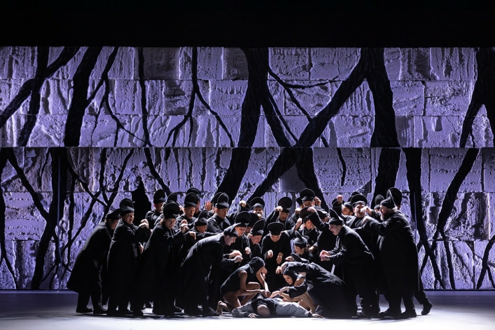 Entre abstraction et figuration, la danse est omniprésente. Pas seulement à l’occasion d’intermèdes qui viendraient ponctuer l’intrigue, mais dans un flux quasi ininterrompu. Car c’est bien la totalité de l’œuvre qui est dansée, aussi bien par les interprètes du Ballet du Grand Théâtre de Genève, magnifiques en horde de gardiens guerriers ou sous l’aspect d’une suite princière encapuchonnée, que par les chanteurs titulaires des rôles dont l’aisance corporelle ne fait pas défaut. Tous forment des ensembles à la fois dépouillés et foisonnants, non dénués de force et de finesse mêlées, pour accompagner les longues et déplorables errances de cœurs malheureux.