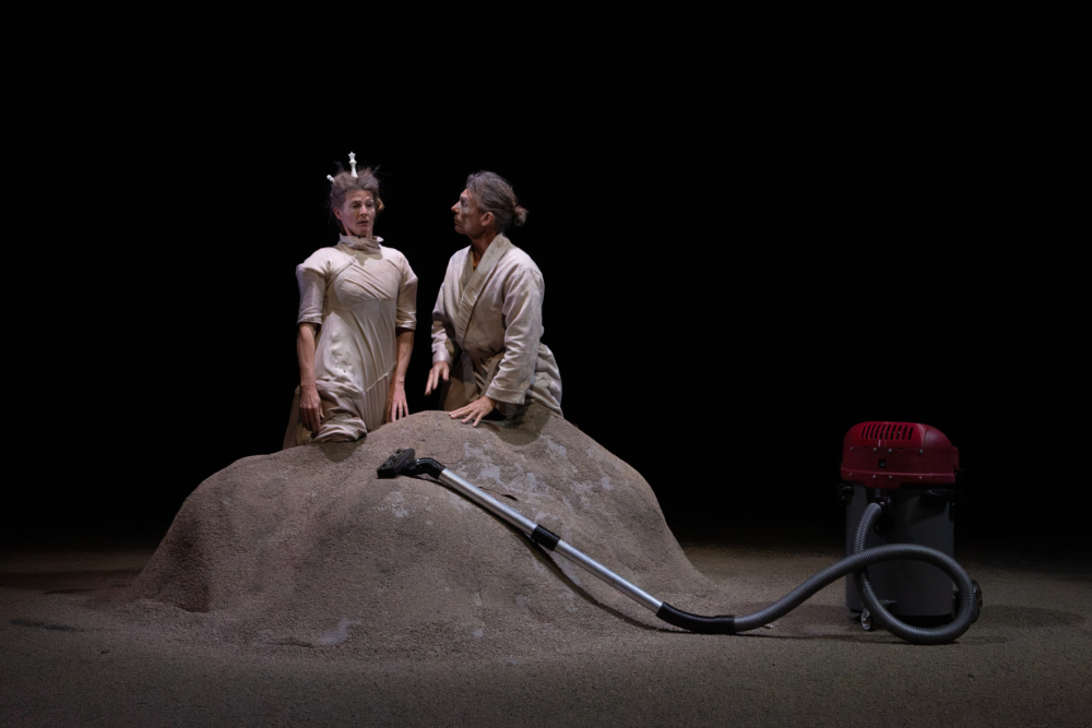 Comme tombés au fond d’un sablier, une reine et un roi décatis jouent aux échecs, à moitié ensevelis sous un monticule de sable. Ils semblent attendre que le temps passe, ou qu’il finisse, peut-être. On retrouve ainsi dès la première image la marque de fabrique de Mélissa Von Vépy, qui explore depuis près de 25 ans le travail aérien, ce qui occasionne chez elle des dispositifs scéniques, souvent uniques. Ici, elle s’accompagne d’Olivier Bovet et de Cédric Cambon (en coulisses) pour présenter un spectacle jeune public d’une grande finesse, dont les premières représentations ont lieu à l’occasion du Festival CIRCa, à Auch. Les pièces de Mélissa Von Vépy brillent en général par leur poésie métaphysique. Ici, il est donc intrigant de voir le dispositif centré autour d’un objet aussi trivial qu’un… aspirateur. Mais la circassienne et sa compagnie s’attèlent avec brio à revisiter la forme du conte, mêlant théâtre d’objets et travail aérien subtil.