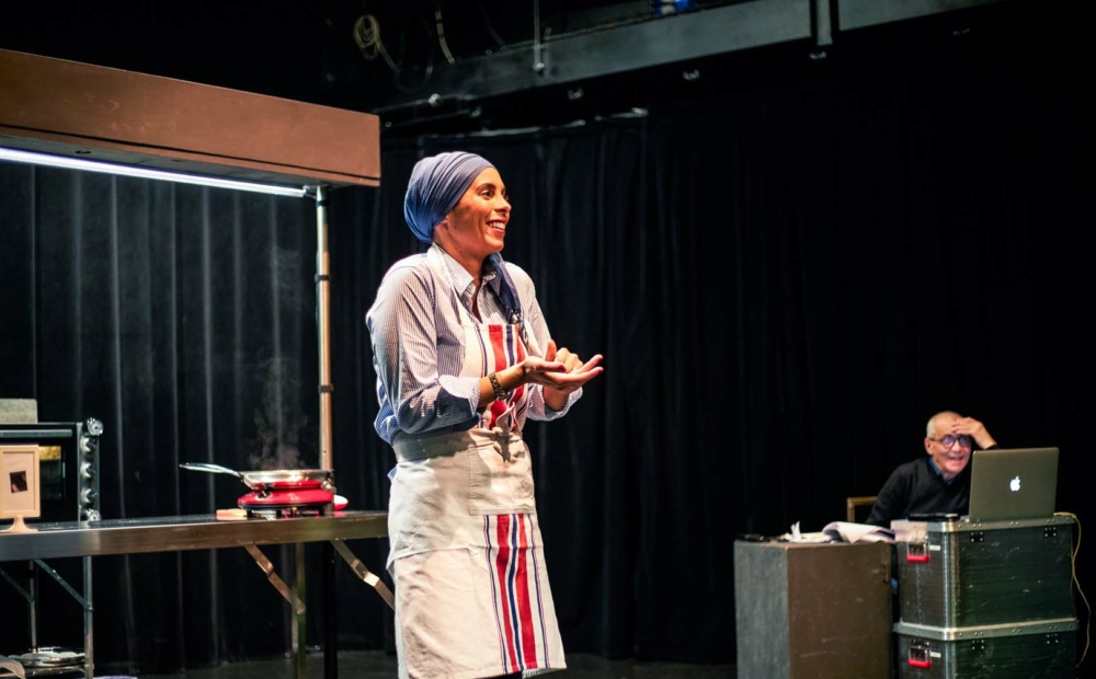 En compagnie d’Ahmed Madani – posté à la Kantor sur le côté –, qui entrecoupe le récit d’Anissa de son point de vue d’auteur-metteur en scène, à la fois philosophe et cabotin, dans la transmission et la dérision, la femme en quête de père concocte donc, en même temps qu’elle raconte son histoire, ses propres pâtisseries et interroge régulièrement les spectateurs sur leur ressenti. Tout cela pourrait être gadget si ne se créait ainsi une forme profondément chaleureuse, l’impression, finalement, d’être en famille. Astucieuse, sous ses dehors d’une grande simplicité, la dramaturgie du spectacle donne également à l’histoire une épaisseur qui n’en finit pas de s’approfondir et agrémente le récit de photos, de passages filmés, d’un véritable suspens et d’un étonnement qui va s’intensifiant. Liens familiaux, capacité à se construire sa propre histoire, caractère émancipateur du théâtre, de la fiction, de l’imagination, histoires intimes que l’on ne cesse de réparer, de répéter, migrations et recompositions des identités, Au non du père charrie avec lui un flot de réflexions qui s’épanouit dans une relation entre la scène et la salle tissée de proximité et de rapports simples, et pourtant inédits. Avec en son centre, Anissa, cette femme aussi facétieuse qu’authentique, humble et fière, bienveillante et entière, l’expérience feel good, et pourtant sans complaisance, se révèle enthousiasmante parce qu’elle noue entre salle et scène une relation joueuse qui ne triche pas.
