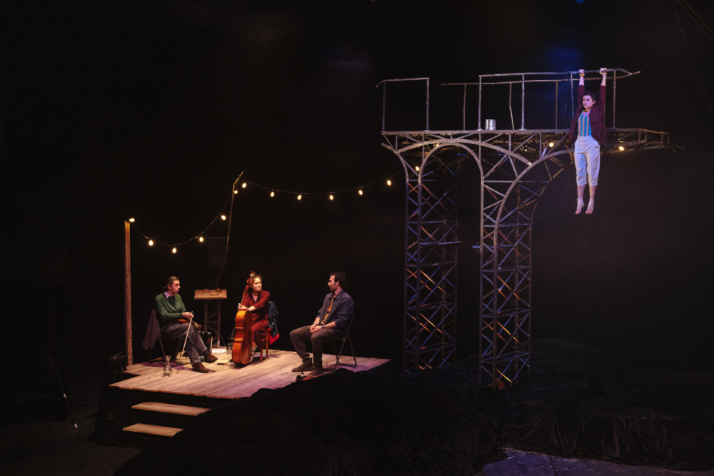 Pleins feux sur la salle et la scène, un homme vient changer une ampoule de la guirlande du décor et repart ; puis, tranquillement, depuis la régie, des personnes descendent des gradins, déplient des chaises posées dans un coin sur le parquet, sortent leurs instruments, testent les cordes de leurs violons et violoncelle… À côté d’eux, l’arche d’un pont métallique. Pas de tapis de réception, pas d’agrès. Où est le cirque alors ? Partout !