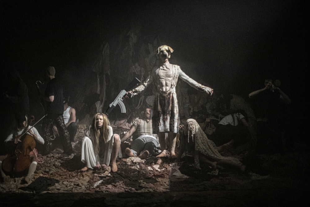 Au cœur du dispositif, un jeu d’échos dissonant entre plusieurs écrans. L’un, central, décrit avec des mots simples les images d’une vidéo de bukkake – on laissera aux curieux le soin d’en chercher la définition – s’exerçant sur une jeune femme d’origine chinoise. Fellations à la chaîne, éjaculations faciales non consenties, insultes et 44 pénétrations en une heure font cheminer par l’écrit à travers l’horreur d’une scène comme ce site en a produit de nombreuses. Viol à l’abattage. Sur les réseaux sociaux, Axelle, avatar féminin du patron Pascal Ollitrault, appâte des jeunes femmes dans la précarité. Elles sont ensuite piégées et maltraitées dans des séquences qui alimentent le site. Certaines, des dizaines, ont porté plainte. Mais, parallèlement à cet écran qui égrène avec froideur les plans successifs de cette pornographie ultra violente d’une femme livrée à une meute d’hommes, défilent sur deux autres écrans qui entourent la scène les paroles revisitées des cantates de Bach, qui, entremêlant les genres, enveloppent l’atroce récit de leur beauté, de leur douceur, de leur intelligence et de leur humour. Les chants portés notamment par Adèle Carlier, Michiko Takahashi et Manon Xardel, accompagnées par l’Ensemble Miroirs Étendus, rendent ainsi les images décrites encore plus odieuses, mais les tournent également parfois en ridicule. Plus que dénoncées, raillées pour leur inhumanité, la musique liturgique accompagnant ainsi une étrange procession avec des hommes masqués – comme ils l’étaient dans les vidéos –, parfois armés ou affublés de masques de chiens, à quatre pattes, tenus en laisse, et avec des femmes costumées de blanc virginal comme pour être conduites au sacrifice, d’autres portant des totems en forme de sein ou de pénis. On oscille ainsi entre les images archaïques de rituels de sacrifices, des parties fines carnavalesques à la Eyes Wide Shut, évocations des viols de guerre et inversion des rôles, entre autres.