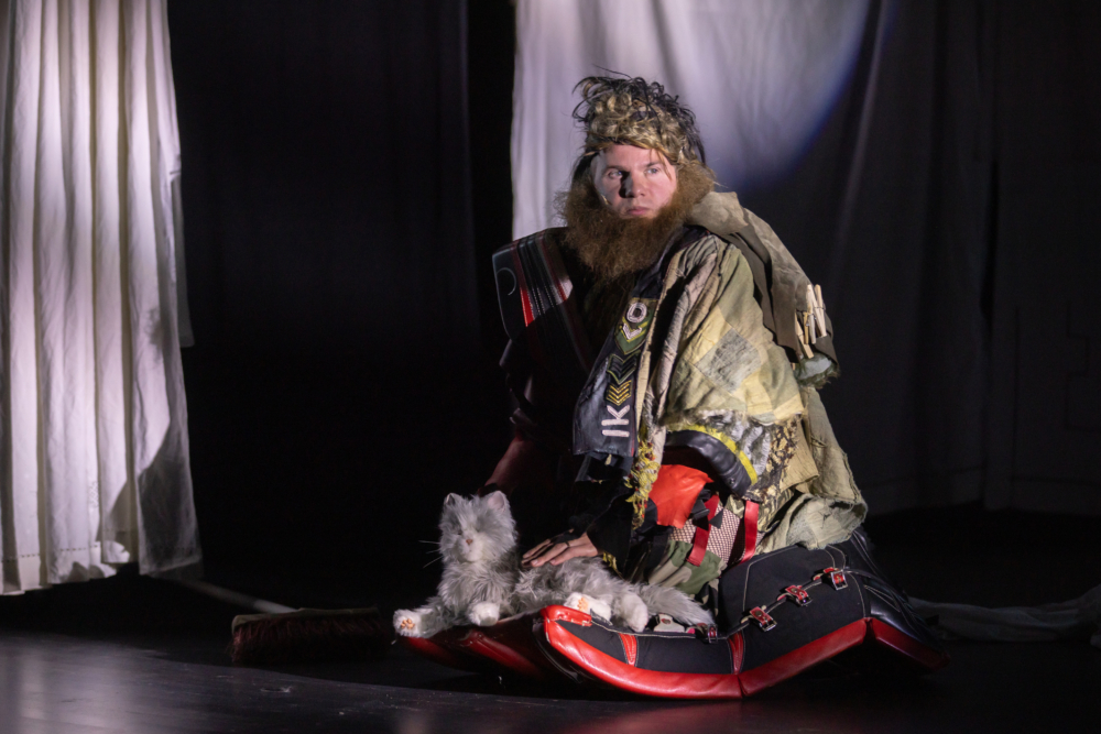 La promesse de le voir se livrer à un exercice en solitaire avec la complicité, et l’expérience, de son metteur en scène fétiche ne pouvait alors qu’aiguiser la curiosité. D’autant que Dimitri Doré a une histoire personnelle qui n’est pas tout à fait linéaire. Né à Jelgava, en Lettonie, en 1997, le jeune homme a été adopté à l’âge de 18 mois par une famille de Reims. « Même si j’ai toujours été poussé à découvrir mes origines, la culture lettone n’a pas vraiment influencé la construction de mon identité », assure-t-il dans sa note d’intention ; et pourtant, c’est cette part enfouie de lui-même que l’artiste semble aujourd’hui vouloir (re)trouver en convoquant les souvenirs, les rêves et les obsessions, enfantines et adolescentes, qui ont pavé son chemin et l’ont peu à peu façonné. Après la diffusion d’un film Super 8 où son père et sa mère, Yannick et Dominique Doré, encore jeunes, vivent de façon (presque) ordinaire Un jour de la semaine pour un couple, le comédien les imagine, à couvert, lors de leur échange sur sa procédure d’adoption dont ils satisfont les formalités administratives ; puis, ce qui paraissait s’ouvrir comme un livre de famille prometteur se renferme aussitôt pour céder la place à une figure pseudo-viking, Oleg – du nom du géniteur de Dimitri Doré, ce que nous apprendrons plus tard –, attifé avec un ensemble de couches et de sur-couches qui lui donnent des airs de créature chimérique. Entre un adorable chat automate qui miaule quand on le caresse et une cigogne en peluche beaucoup plus traditionnelle, l’homme apparaît rapidement comme le premier spécimen d’une galerie d’avatars que, de la gymnaste spécialiste du cerceau aérien à la responsable de l’orphelinat où il a été adopté, le comédien se plaît à invoquer – pas toujours à vue – au milieu de ces draps blancs qui lui servent de décor et de supports de projection.