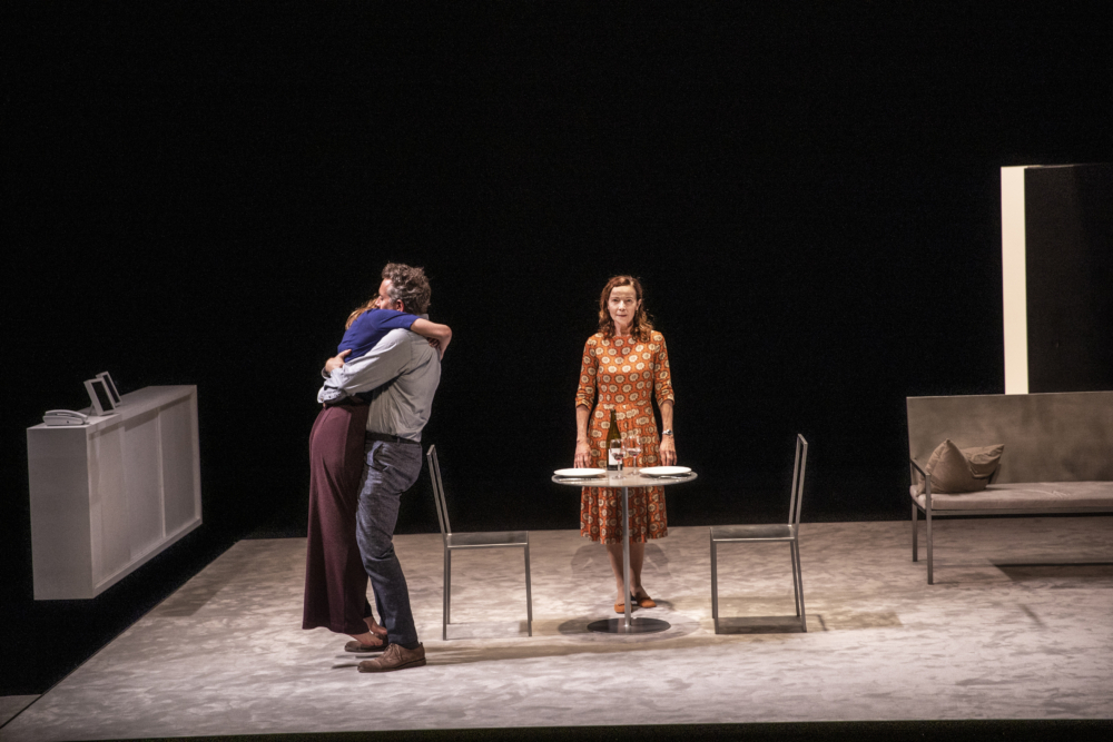 Soumise à une forme d’instabilité émotionnelle, elle ne paraît plus sûre de rien, à commencer par elle-même. D’un instant à l’autre, d’une phrase à l’autre, elle glisse d’état de conscience en état de conscience, dans une alternance permanente qui fait toute la magnificence de ce texte. Tantôt on l’entend se résoudre à sa solitude, voire s’en gargariser, comme si elle voulait s’auto-persuader que l’homme ne comptait plus ; tantôt on la voit espérer sa venue, attendre que le téléphone sonne et nier toute disparition, comme si la phase de déni, incontournable dans une période de deuil, n’était pas encore finie. Quand soudain, alors qu’elle est assise sur la banquette qui lui sert de sofa, son visage s’illumine. Elle le voit, enfin, sous la forme d’une hallucination ou d’un fantôme indiscernable à nos yeux de spectateurs lambdas, avant de reprendre ses esprits et le cours tumultueux de son incertitude. Tandis que tout semble pour elle perdu, une porte s’ouvre, et l’homme surgit. Cheveux mouillés, peignoir sur le dos, il paraît sortir de la douche, et entame avec celle qui lui fait face une discussion minimaliste et quotidienne, en appuyant simplement sur le fait qu’il se sent « fatigué ». D’abord transie de joie, la femme opère au bout de quelques échanges un étonnant renversement. À l’observer se replier sur elle-même et se rembarquer dans son soliloque, on comprend qu’elle ne le voit plus. En un tour de main, Jon Fosse brouille alors les frontières du réel et de sa perception, et oblige le public à interroger la véracité non plus seulement de ce qu’il entend, mais aussi de ce qu’il voit.