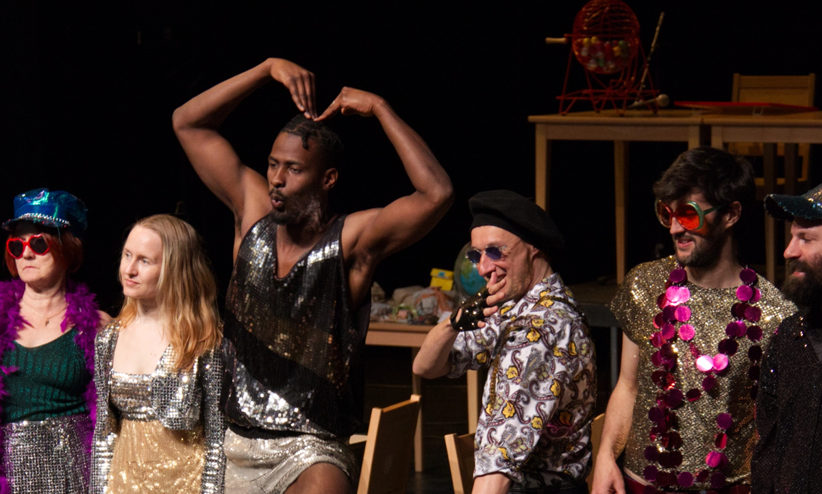 Dans une Helsinki franco-fictive, alors qu’au dehors règne pluies diluviennes et individualisme, un petit groupe d’individus soigne sa fièvre du samedi soir en jouant au loto. La partie est animée par Annikki, sorte de madone des déclassés de la société, dont le tempo régulier offre chaleur et soulagement aux joueurs venus chercher ici un peu de réconfort. Diskoteekki, qui signifie discothèque en finnois, est une réflexion sur l’enchantement. Venez voir comment des solitudes s’assemblent et se révèlent, comment une sinistre salle des fêtes où l’on s’ennuie se transforme en discothèque où l’on danse !