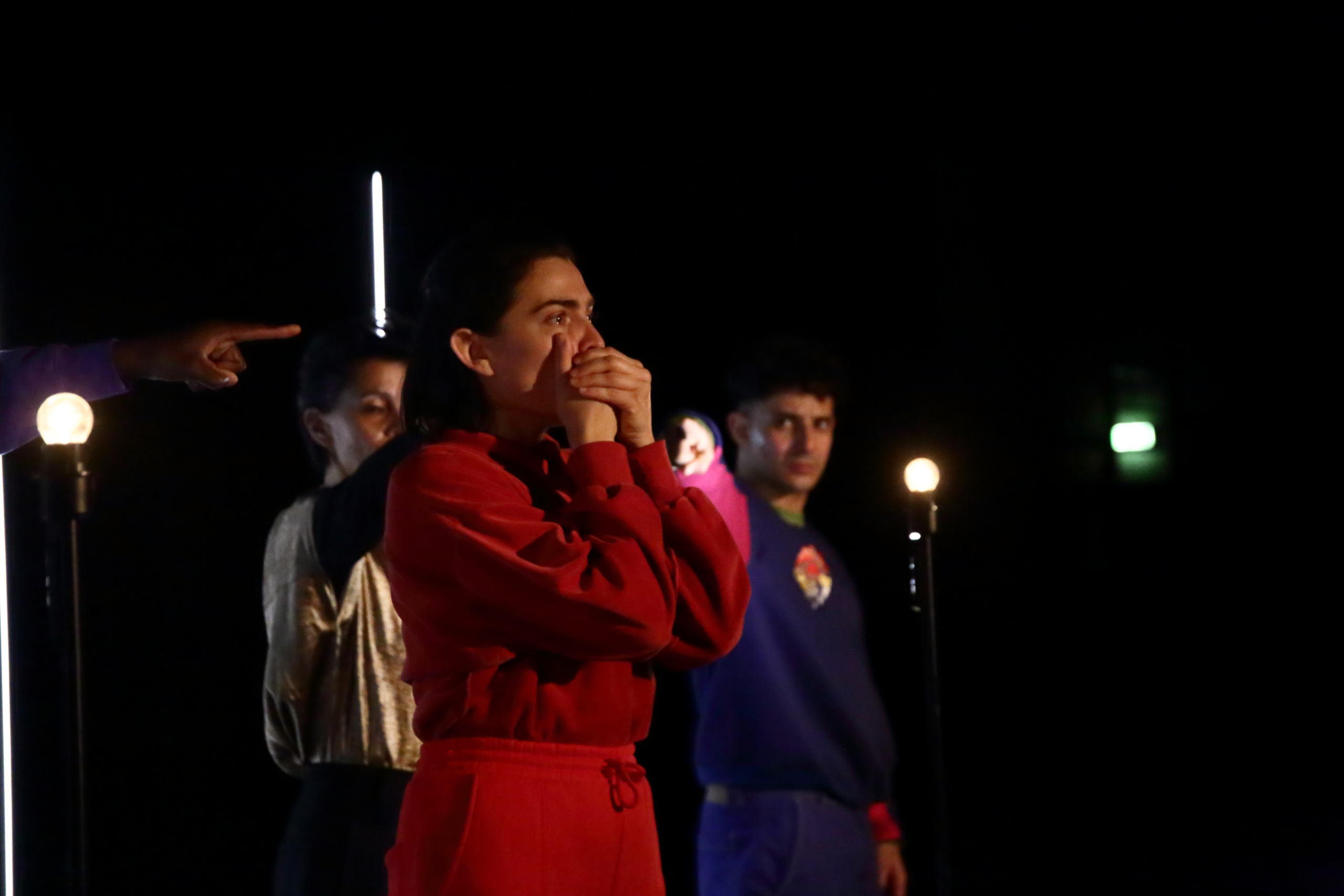 C’est l’histoire d’une petite fille qui ne peut pas dormir nous dit la voix off pour commencer. Enfin, il s’agit là du second commencement, car, dans les quelques minutes précédentes, toutes lumières allumées, la metteuse en scène Émilie Le Roux, entourée des trois comédiennes et deux comédiens d’Azaline se tait, a pris la parole. Elle a précisé à l’assemblée des enfants (dès 10 ans) répartis dans les gradins en tri-frontal que, s’ils ne sentent pas très bien, deux personnes référentes, dont elle, sont dans la salle, une petite loupiote dans la main pour être reconnaissables. Mais maintenant, « Laissez-nous vous raconter cette histoire », nous adresse-t-elle. Au début du travail avec sa compagnie des Veilleurs, la Grenobloise avait déjà donné des lectures de ce vif texte que Lise Martin a publié en 2010. Mais parce qu’il traite de l’inceste et des violences faites aux enfants, il était presque irresponsable de ne pas mettre en place un dispositif pour permettre aux plus jeunes de quitter la salle, recueillir leurs premières paroles, voire celles des adultes accompagnants si cela fait ressortir un trauma, puisque, selon les chiffres de la CIVIISE (Commission indépendante sur l’inceste et les violences sexuelles faites aux enfants), ce sont 160 000 enfants par an, donc trois par classe en moyenne, qui sont victimes de violences sexuelles.