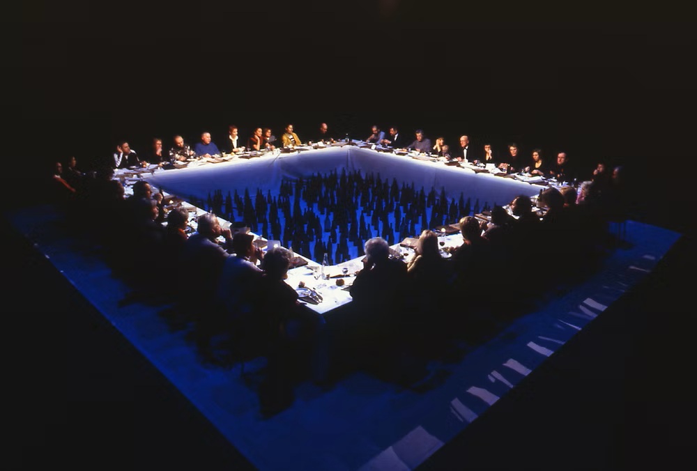 Salle et scène sont ici complètement confondus et rien ne distingue les acteurs de leurs « invités ». L’œil dicte tout d’abord sa perception des choses. Une scénographie de la table, baroque et aristocratique. Géométrie presque rituelle, appel aux plaisirs gastronomiques, installation plastique, table de fête, cène : scène.