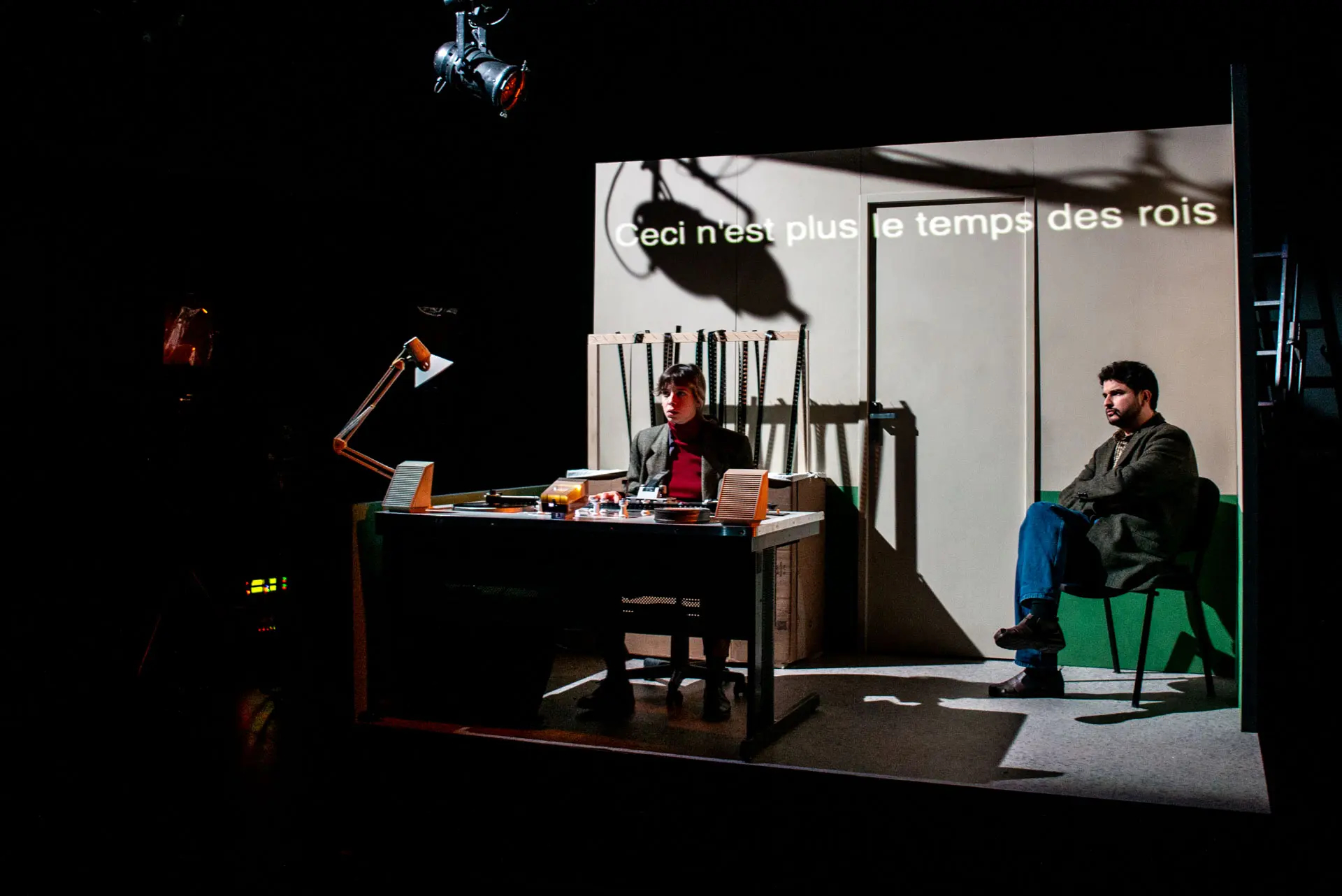 Depuis ses débuts, le duo d’auteurs, metteurs en scène et acteurs, formés à l’ENSATT comme interprètes (promo 76, sortie en 2017), intègre à son travail la façon dont il se construit. On appelle ça pompeusement du métathéâtre, mais c’est d’abord leur manière de ne pas s’imposer en surplomb de leurs ambitieux sujets, politiques et quotidiens : comment on fait face à la pauvreté (En réalités, d’après La Misère du monde de Pierre Bourdieu), comment on s’identifie intimement et donc aussi socialement (5-4-3-2-1 j’existe (même si je sais pas comment faire)), comment on lutte pour qu’un théâtre, un espace commun, reste ouvert (Œuvrer son cri, inspiré des occupations de Nuit debout), comment on définit la norme et qu’est-ce que la folie (La Brande), comment on tient en équilibre avec un duo de circassiens (À tout rompre) ou encore comment on écrit l’histoire des vaincus (Radio Lapin, histoires de luttes dans le cadre de la série Grand ReporTERRE du Théâtre du Point du Jour, à Lyon). À chaque fois, en se demandant comment traiter cela, ils ouvrent un champ de réflexion qui n’aurait pas la même force si elle ne se faisait pas les mains dans le cambouis. Il faut fabriquer, plier, ranger, remiser comme, ici encore, pour créer. Et pour cela, affirment-ils une nouvelle fois, à travers les Straub/Huillet et leur propre voix, « mieux vaut être deux » pour résister. Au plateau, il y a donc Alice et Sacha introduisant Jean-Marie et Danièle (quelles interprétations !), mais il y a aussi, au fil du spectacle, Sacha qui s’adresse à Danièle. Car peu à peu, leurs préoccupations entrent en dialogue, sans que l’on s’en aperçoive. Les coutures de ce texte très ciselé ne se voient pas. C’est qu’ils ont dû, comme les Straub avec leur pellicule, faire beaucoup de rewind jusqu’à trouver l’équilibre.