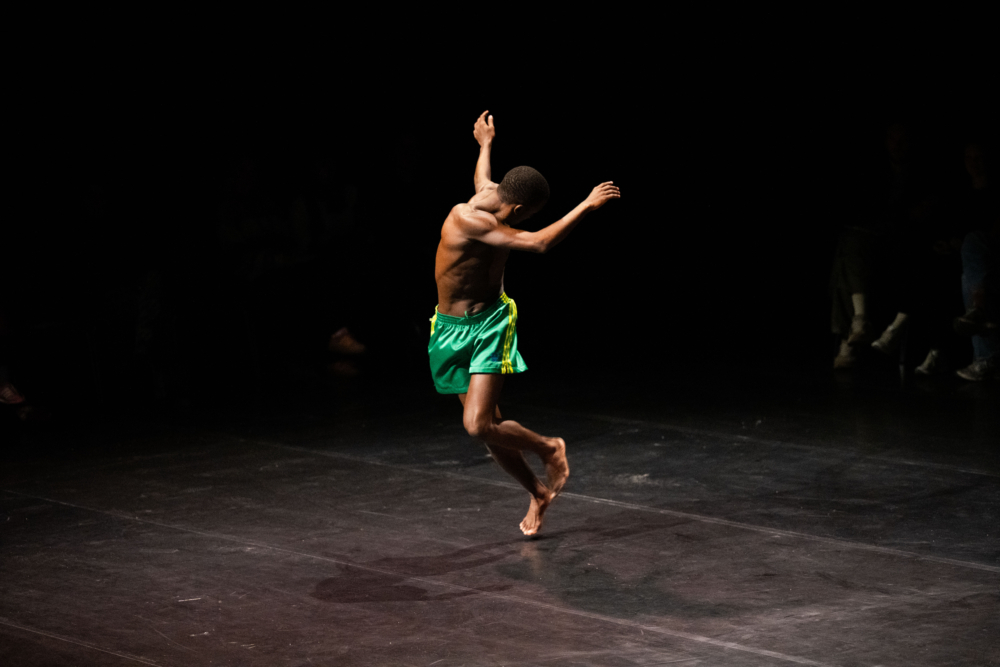 On l’a vu dans aCORdo (2018) où il comptait parmi les performeurs endormis, les uns sur les autres, ou plus récemment dans l’ensemble dynamique ZONA FRANCA (2023). Dans cette dernière, Hiltinho Fantástico révélait ses meilleurs pas de passinho, une danse urbaine brésilienne qui signifie « petits pas ». Dans Puff – en portugais, un « souffle léger » et éphémère, indique le texte de présentation du spectacle –, sa danse se déplie avec grâce et fluidité. Elle berce le regard au fil de ses déséquilibres, contrebalancés par le poids de sa tête, qu’il incline. Si le début apparaît comme un échauffement, les jeux de jambes caractéristiques du passinho – les pieds qui frottent sur le sol comme pour écraser une cigarette – s’accélèrent peu à peu, pour devenir un enchaînement de dribbles furieux, ponctué de descentes accroupies et de sauts, les jambes relevées vers la poitrine.