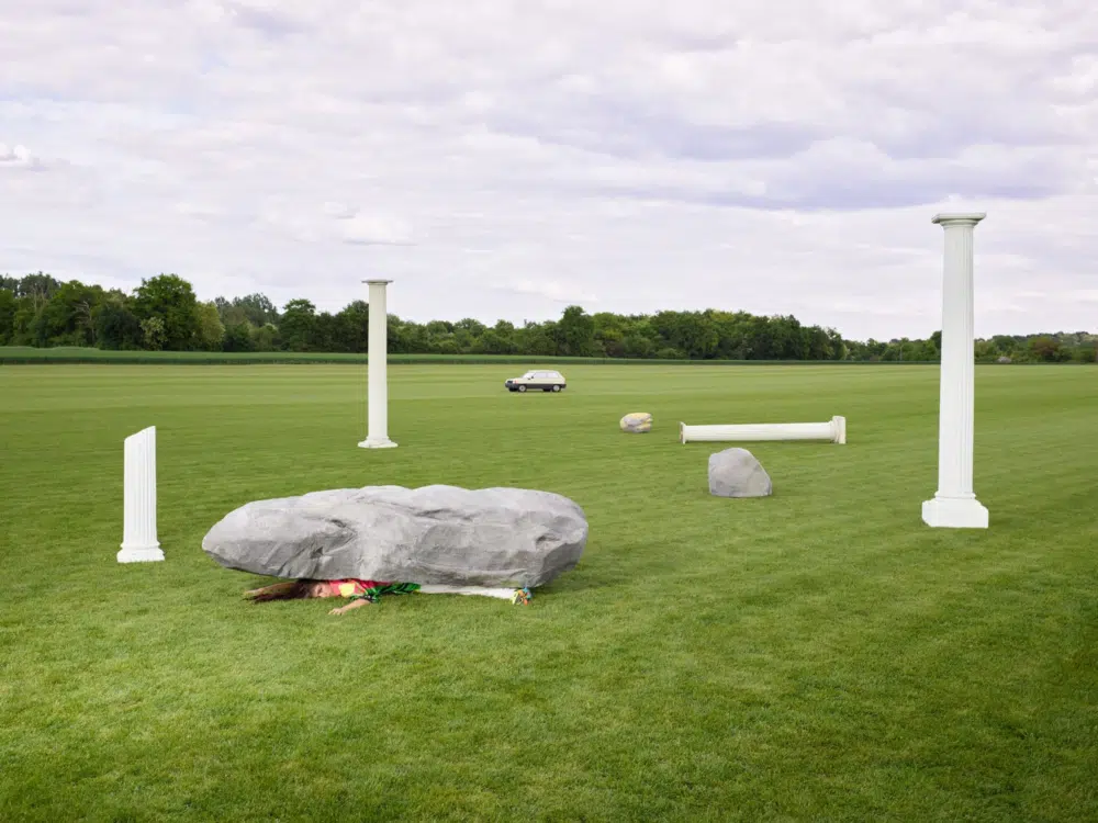 Porter le poids du monde sur son dos, cela fait bien longtemps que Vimala Pons le pratique. Grande et Le Périmètre de Denver ont été des expériences un peu sidérantes en ce sens. Trouver le point d’équilibre physique, très précis, pour que ça tienne, sans pour autant mettre le public dans une situation de voyeurisme morbide. Au contraire, il s’agissait de voir ce que cette contrainte physique lui permettait – en l’occurrence de se métamorphoser dans Denver. Au début de Honda Romance, la voici écrasée au sol par un satellite qui diffuse des infos sur ses écrans usés. Déjà, elle n’est plus seule tout en l’étant quand même, car, à ses côtés, un type se contente, impassible, de faire des photos et une autre est figée dans l’effroi de la scène qu’elle regarde, mais, au fond, rien n’a changé. Vimala Pons doit se débrouiller seule pour se relever. Les témoins ne mobilisent personne. L’union est un concept inopérant ici : une parabole puissante de l’état misérable du monde. Un musicien aussi est là, à vue, donnant l’indication que le son va être une trame centrale de ces 75 minutes. Musicienne de formation, Vimala Pons retrouve des complices historiques : Tsirihaka Harrivel à la collaboration conception, mise en scène et composition musicale et Rebeka Warrior à la composition musicale du chœur. C’est précisément en parlant de Rebeka Warrior (et de Théo Mercier) sur France Culture, fin août, que l’artiste disait qu’elle ne renonçait « jamais face à l’absurde, l’écrasement, la répétition infinie ». « Ils incarnent une force de survivre, une ‘obstination antique’, qui appartient à des héros mythologiques, des gens aussi idiots que courageux […] qui arrivent à transformer les choses quotidiennes comme les deuils, à les porter, à en faire poème, en faire chant, et donc en faire consolation ». Sans doute, parlait-elle alors de Honda Romance, dont elle était alors à quelques jours de l’accouchement, car il serait difficile de mieux définir ce spectacle.