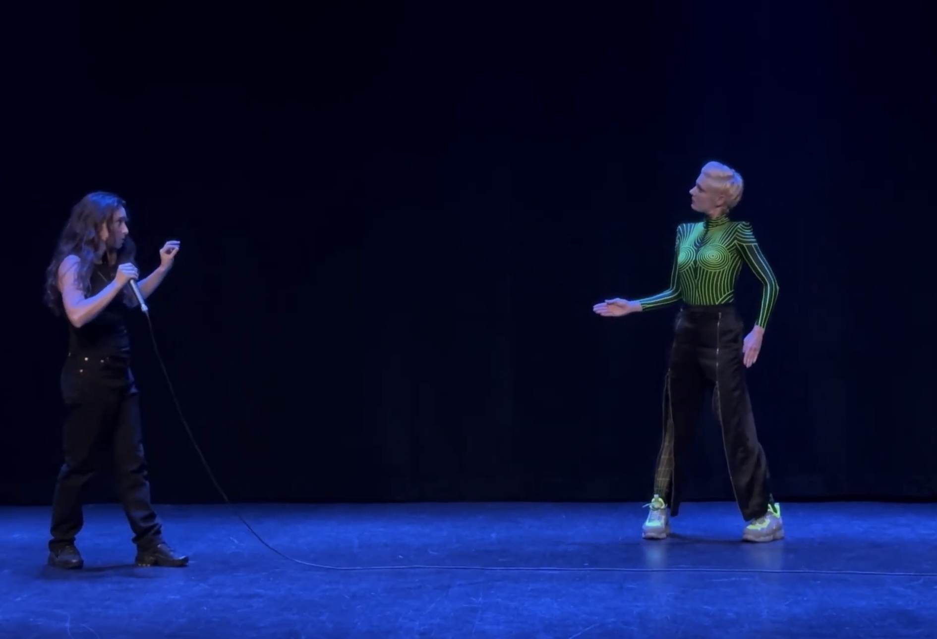 Le corps devient instrument, la voix devient matière. Ensemble, respiration et inspiration nous guident dans un voyage sensoriel, entre univers clubbing et esthétique du gaming. Sur scène, la complicité des artistes se construit en temps réel, brouillant les repères, invitant à une expérience où le tangible et le virtuel se confondent.