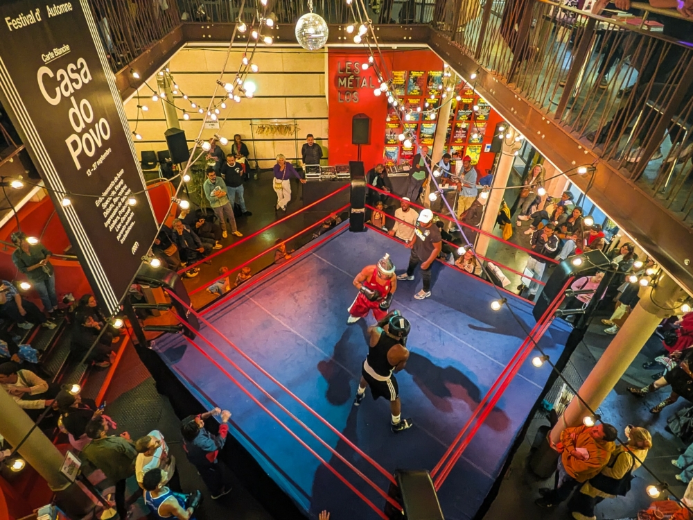 Un ring de boxe occupe l’ensemble du hall de la Maison des Métallos tandis que, dans la salle principale, est diffusé le film de Gabriela Carneiro da Cunha et d’Eryk Rocha, La Chute du Ciel. De l’autre côté de la cour, il faut imaginer les 2-5 ans gazouiller dans le sable sous le regard de l’artiste et éducatrice Graziela Kunsch pendant que les 6 ans et plus partent à l’assaut de l’atelier de boxe que le collectif brésilien Boxe Autônomo anime en partenariat avec un club de Bobigny. Les parents, pendant ce temps, peuvent flâner sur la mezzanine surplombant le hall, s’adosser au zinc du bar ou observer le fonctionnement de la presse qui imprime tracts et zines à la demande. En cette rentrée, la Maison des Métallos bruisse d’une énergie nouvelle. Un an après s’être installé à la tête de cet établissement culturel de la Ville de Paris, dont la fin de saison 2024-2025 avait été partiellement bousculée par l’occupation de jeunes exilés qui y avaient trouvé refuge pendant trois mois, sa directrice, Alice Vivier, est enthousiaste à l’idée d’accueillir cette carte blanche, temps fort du prestigieux Festival d’Automne. « On a confié nos clefs à la Casa do Povo les yeux fermés et le public est au rendez-vous », se réjouit-elle.
