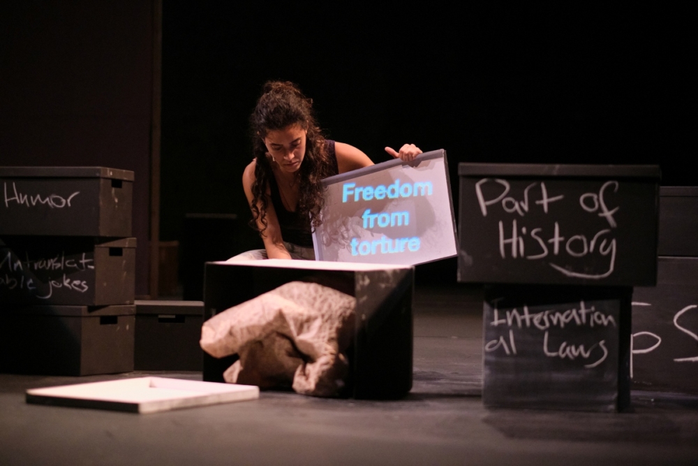 Lorsque le spectacle débute, on découvre quelques boîtes, sortes de cubes noirs à cour, et un très simple mobilier (un banc-coffre de bois) à jardin, tandis qu’un châssis avec drap blanc trône plutôt en fond de scène. Ces éléments modestes, Marah Haj Hussein va les manipuler, s’en servant également volontiers de surface de projection de textes (en arabe ou en anglais) comme d’écriture. Car, comme la jeune femme nous l’explique en ouverture, le multilinguisme est au cœur de sa vie : l’arabe avec sa famille (sa langue maternelle), l’hébreu, langue officielle de son pays, le flamand, car vivant désormais en Belgique, et l’anglais, langue véhiculaire et quotidienne pour elle. Ces différentes langues, les rapports variables qu’elle entretient avec chacune, comme les rapports entre les langues elles-mêmes, dessinent un paysage multiple, complexe, où les symboliques et rapports de pouvoir se sédimentent.