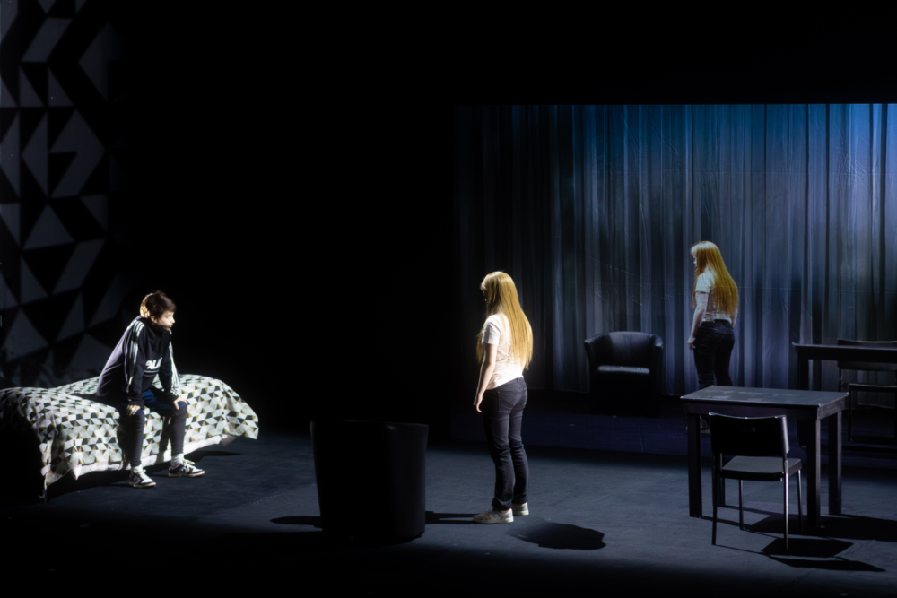Paraissant reprendre là où il s’était arrêté avec Contes et Légendes, Joël Pommerat réinvestit le territoire adolescent pour en poursuivre l’exploration, mais décale d’entrée de jeu le regard à l’aide d’un premier tableau, sublime, où deux silhouettes, de plus en plus grandes à mesure qu’elles avancent, cheminent vers nous, comme si elles venaient d’un autre univers ou d’un lointain passé, comme si le metteur en scène matérialisait un « Il était une fois » sans qu’il soit prononcé. Ces silhouettes, ce sont celles de Jade et Marjorie, deux collégiennes a priori ennemies. Quand la première apparaît discrète sous ses airs de bonne élève, la seconde, avec son allure de garçon manqué, est violemment effrontée, capable d’envoyer balader le CPE qui lui reproche le harcèlement qu’elle fait subir à sa camarade à travers des « jeux dangereux », bientôt redoublés de menaces de mort. Tandis que Marjorie, qui habite à côté de chez Jade, ne tarde pas à se faire renvoyer, et à rester claquemurée chez elle où ses parents la battent, la voilà qui déboule, le soir venu, dans la chambre de sa victime qui, face à ses nouvelles tentatives d’intimidation, lui lâche un secret : la nuit, ses parents se transformeraient en « créatures maléfiques » et commettraient des « actes horribles » en faisant « comme si de rien n’était » au petit matin.