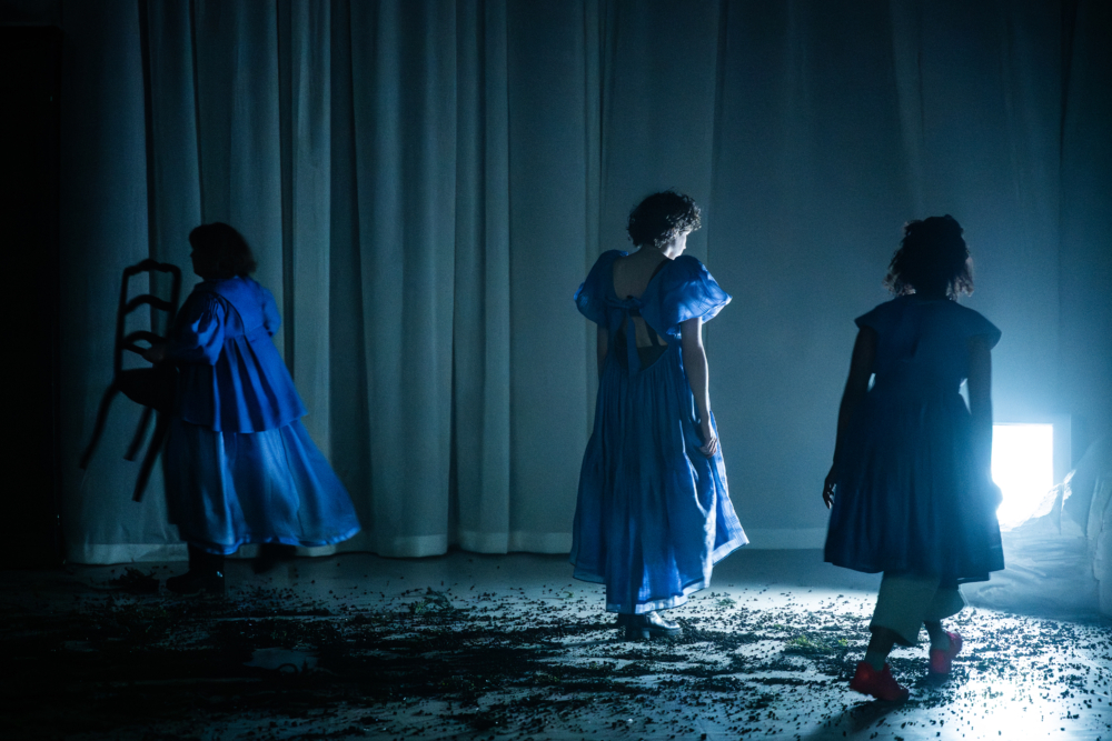 Trois longs rideaux fantomatiques délimitent l’espace et confinent les figures qui l’occupent. Quatre confuses silhouettes revêtues d’une robe de bal, d’un vague style victorien aux teintes bleu violacé, s’avancent en lent cortège et déplient nonchalamment quelques gestes d’une danse accablée. Entre une roche et une bâche se niche une télévision défaillante dont le glitch sur l’écran évoque la neige qui tombe. L’absence de couleurs suggère l’hostile lande hivernale du Yorkshire, tandis que le vent qui souffle avec rage est convoqué au moyen de plusieurs ventilateurs suspendus et actionnés. L’ambiance sonore réalisée en live participe également à installer l’étrangeté d’une atmosphère habitée d’un mauvais présage. C’est en ouvrant les portes d’une armoire massive que la pièce pénètre dans le récit de l’intimité austère de la dysfonctionnelle famille Earnshaw. Plus tard, renversé, le meuble devient l’imposant caveau sur lequel se scellera le dénouement funeste. La terre macule la froide blancheur qui domine sur le plateau où se confrontent le pur et l’impur. Pour autant, la sauvagerie organique, viscérale, à laquelle le roman d’Emily Brontë accorde une place prépondérante, ne semble pas être le parti pris par la metteuse en scène, qui en signe une adaptation scénique peu démonstrative, voire aseptisée.