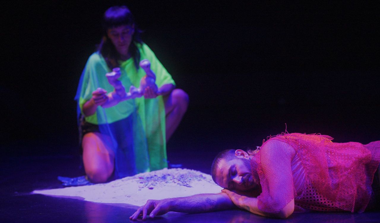 « Les théâtres sont des lieux de célébration qui se réinventent collectivement », commence Marcela Santander Corvalán. Évoluant autour de petits bancs de sable disposés sur la scène, elle et son comparse, Gérald Arev Kurdian, font apparaître des paysages chatoyants, des océans mystérieux et un dancefloor bouillonnant. Puisant dans des légendes du Chili, dont elle est originaire, et dans des coutumes boliviennes, Marcela Santander Corvalán déploie, dans Agwuas, un rituel, où mythes, réflexions décoloniales et ambiance festive s’allient dans un ensemble transdisciplinaire. Dans la même lignée que l’intense Bocas de Oro (2023), ce duo tient sa promesse de célébration collective.