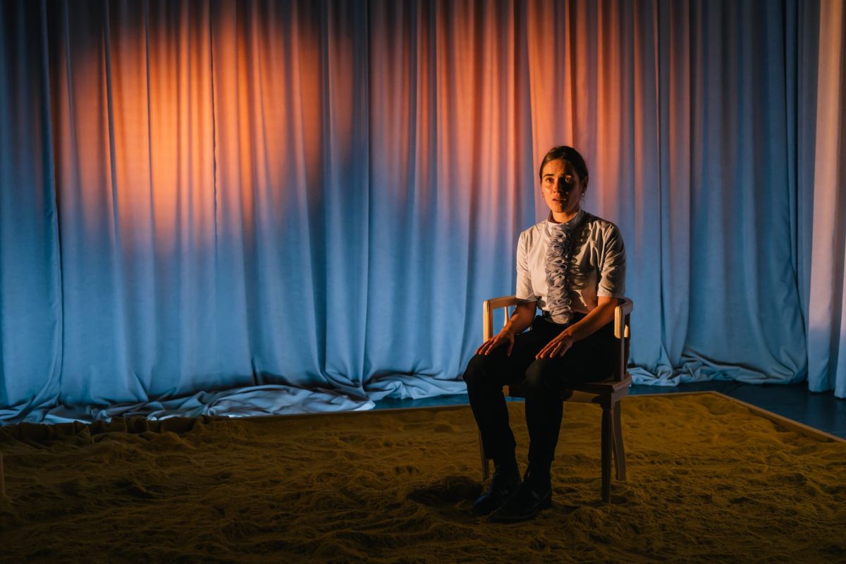 Comme l’indique la fiche Wikipédia du Papier peint jaune, la nouvelle de l’écrivaine, poétesse et conférencière américaine Charlotte Perkins Gilman fut, lors de l’une de ses traductions en français (celle de 2002), publiée sous l’intitulé La Séquestrée. Un choix de titre ouvertement féministe qui, en pointant avec pertinence la situation de la narratrice, laisse un peu plus de côté le contexte, notion contenue dans l’intitulé originel de The Yellow Wallpaper. Cette nécessité de ne pas oblitérer le paysage qui va accentuer la détresse de la protagoniste, l’adaptation qu’en livre Alix Riemer au plateau la porte chevillée au corps, en incluant à son tour un contexte encore plus large. Ainsi, la comédienne Marie Kauffmann commence, telle une conférencière ou une enseignante – citations de Wikipédia à l’appui –, par nous donner des éléments biographiques. Rejoignant l’avant-scène, elle se tient d’abord éloignée de l’espace scénographique situé derrière elle – un carré de terre sableuse jaune comportant une chaise et des bougies, pour quelques-unes allumées, et, derrière, deux rideaux bleu-gris, l’un rejoignant en partie le carré de sable. Encore à distance du décor et, donc, du cœur de l’histoire, vêtue d’un jean, d’une chemise entre le bleu et le gris clair et d’une singulière cravate bouffante de même couleur – dont le coloris comme le velouté renvoient aux rideaux –, elle présente l’autrice. Elle détaille son importance pour d’autres écrivaines féministes, l’influence qu’eut la parution de cette nouvelle sur les thérapies du repos imposées aux femmes – d’autres exemples étant cités, tel celui de Rosemary Kennedy, qui subit même une lobotomie à la violence inouïe –, ainsi que… les positions racistes et antisémites de Charlotte Perkins Gilman – ce signalement valant ici mise à distance de l’autrice et sauvetage de la nouvelle.
