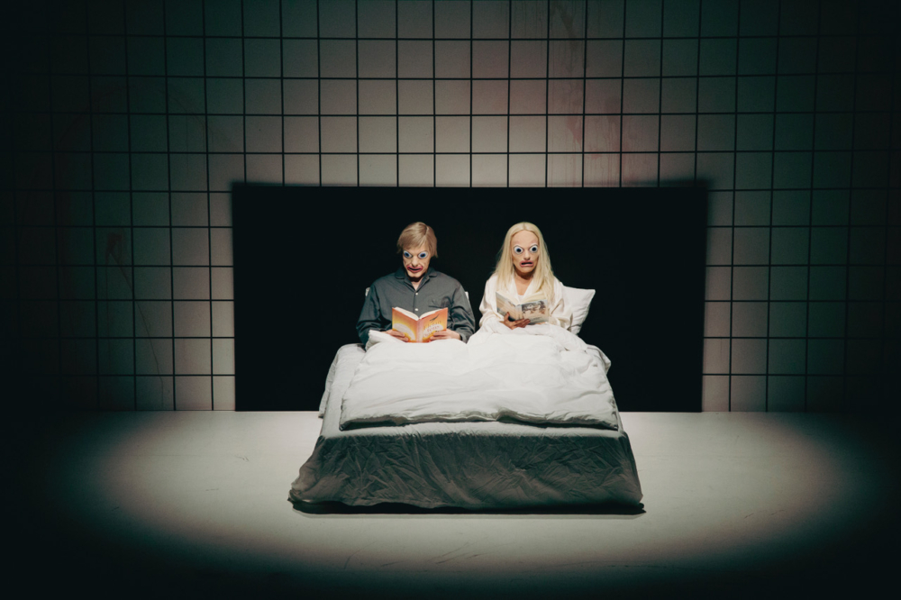 Adapté une première fois en 2023, Markus Öhrn s’empare à nouveau de Scènes de la vie conjugale, dans une version tout à fait inédite, portée cette fois par une distribution française. L’occasion de relire la fable bergmanienne à l’aune des violences domestiques — physiques et psychologiques — qui surgissent dans le secret et l’enceinte de nombreux couples. Pour ce faire, le metteur en scène transpose le film de Bergman dans un univers ubuesque, refusant toute forme de réalisme. Au milieu des murs décapés d’une « boîte blanche », affublés de masques grotesques, Johan et Marianne deviennent les avatars d’un jeu cruel et ridicule, qui évoque autant la tradition du Grand-Guignol que la violence saturée de certains cartoons. Cette violence désinhibée, volontiers excessive et caricaturale, est tendue au public tel un miroir déformant — reflet probable de nos propres pulsions refoulées, ou simplement dissimulées derrière la mascarade sociale.