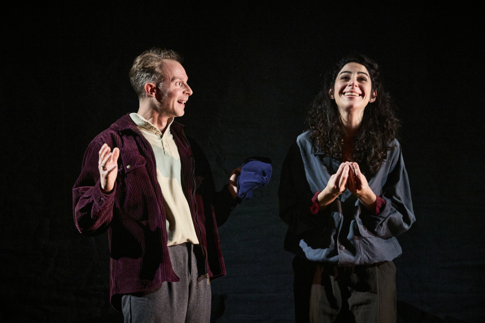 L’introduction s’est pourtant faite astucieusement dans le noir, au son de l’accordéon de Marion Chiron, qui va intervenir à plusieurs reprises en compagnie de son collègue Anthony Caillet aux cuivres, et surtout aux sons électroniques, mais ce qui surgit de ce travail dénué d’effet de projections, ne serait-ce que de lieu et de dates, est le duo formé par Damien Zanoly et Karyll Elgrichi. Ensemble, ils ont déjà souvent joué sous la direction de Jean Bellorini, puisque le comédien intègre la troupe dès La Bonne-Âme du Se-Tchouan en 2013 et qu’elle joue sous sa direction depuis Un violon sur le toit, onze ans plus tôt. Tous issus de l’École Claude Mathieu à l’instar de la metteuse en scène, assistante du directeur du TNP sur de nombreuses créations, ils parlent un même langage : celui d’un théâtre bondissant, malgré la torpeur des destins récités, et d’une confiance en la création lumière et costumes pour les accompagner dans un périple musical, forcément musical.