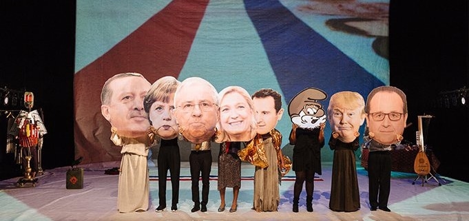 Dans une forme radiophonique et polyphonique, où les comédiens, en ligne derrière des pupitres à l’instar de solistes interprétant un oratorio, le texte est restitué d’abord d’un ton distant puis de plus en plus passionné. La représentation bascule ensuite dans une mascarade aussi joyeuse que savante, un blasphème haut en couleur, organisé d’une main de maître par Stemann. Tels des prophètes des temps nouveaux, les acteurs se masquent le visage de pancartes en carton sur lesquelles est collée la tête du nouveau président des Etats-Unis, Donald Trump. La pièce prend alors la forme d’un show télévisuel bourré de réactions et de références intempestives à l’actualité.