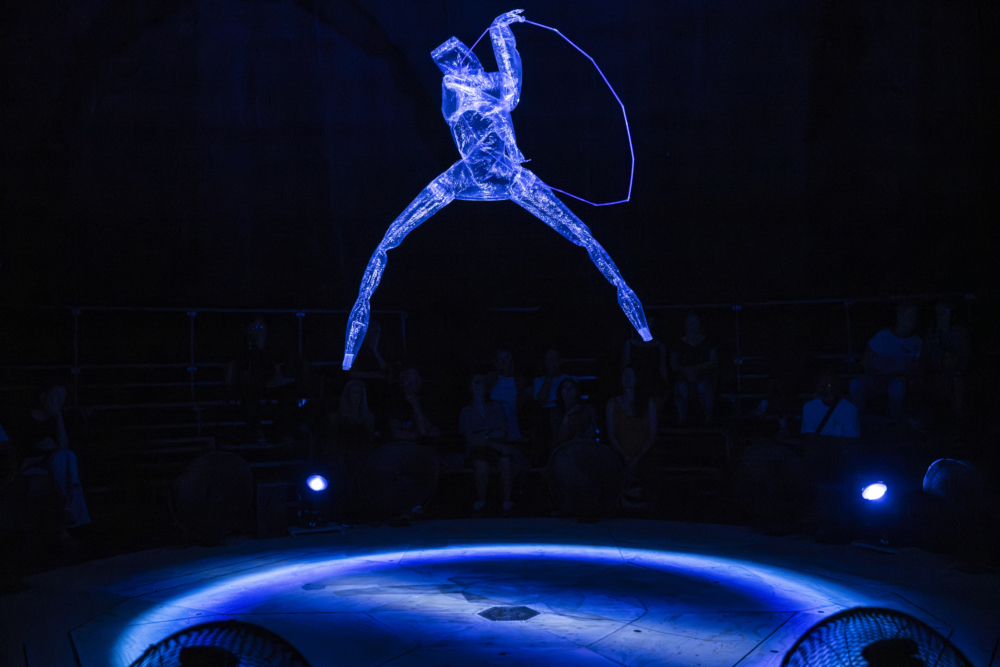 La jauge est petite : 120 ou 140 places assises selon les configurations, sur trois rangs circulaires percés de part et d’autre par l’entrée des artistes et du public. Il n’y a pas là l’espace pour le gigantisme du décor de Maison Mère ou la dureté de celui d’Art. 13, qui avait fini par plomber le travail créatif de cette artiste majeure qu’est Phia Ménard. En 2008, elle créait coup sur coup deux de ses œuvres phares, P.P.P., une pièce d’un cycle consacré à la glace, et L’après-midi d’un foehn, première version bientôt augmentée et doublée de Vortex, fascinante pièce du vent. À chaque fois, la métamorphose intime est au cœur du sujet ; puis, Phia Ménard va développer des projets plus amples et frontalement politiques, paradoxalement moins puissants. Nocturne (Parade) semble synthétiser toutes ces approches avec une simplicité apparente qui n’a d’égale que son ingéniosité.