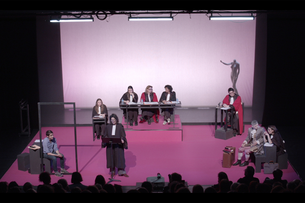 Après deux avertissements projetés sur un écran, donnant non sans humour les modalités de ce qui va suivre – notamment le retour du plaignant André Chénier d’entre les morts –, le procès débute. C’est sur un plateau avec un rideau en fond de scène – dont l’ouverture et la fermeture marquent les étapes du procès –, un mannequin de femme – tel qu’on en trouve dans les magasins – à cour, et où les positions de chacun·e reprennent symboliquement celles des protagonistes dans un tribunal que l’ensemble se déroule. Décalant la controverse universitaire et médiatique au théâtre, Gaëlle Marti et Bérénice Hamidi s’autorisent des glissements, qui signalent la recherche d’adhésion du public : outre que l’accusation d’André Chénier, qui s’estime lésé, est jugée comme un crime (plutôt qu’un délit) – ceci autorisant le procès d’assises avec le recours à des juré.es issu.es du public –, l’affaire est fictionnalisée avec le lancement par une étudiante, Salomé Gaber, du hashtag #cheniercultureduviol. Et c’est l’étudiante que le poète mort accuse donc.