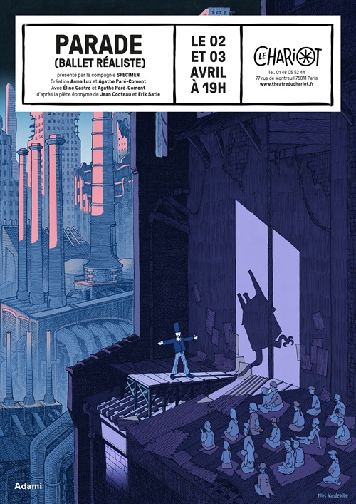 Nous avons imaginé Parade comme une variation dystopique autour des travaux du poète Jean Cocteau et du compositeur Erik Satie. Nous faisons se rencontrer deux univers : un monde forain foisonnant de prestidigitateurs et d’acrobates burlesques et un futur dystopique, miroir déformant de notre monde d’aujourd’hui. Avec cette réécriture joyeuse et dévastatrice, brouillant les frontières du théâtre, de la danse, de la peinture et du cinéma, nous voulons célébrer un spectacle de la “science-fiction poétique”.