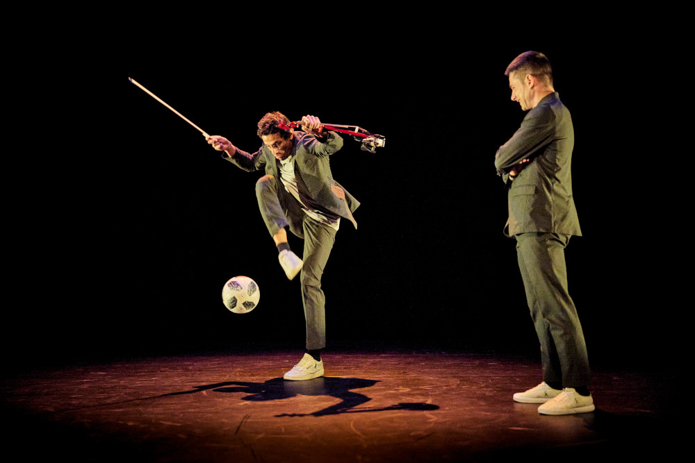 Pépite de musicalité dansée, °Up signe la rencontre du ballon rond et du violon grâce à deux interprètes formidables. Le musicien Gabriel Majou et le joueur de foot Paul Molina s’adonnent à leurs disciplines respectives jusqu’à faire corps et œuvre commune. À la tête du Phare – CCN du Havre, le chorégraphe Fouad Boussouf crée ce duo étincelant sous le regard ébahi d’une cohorte d’enfants.