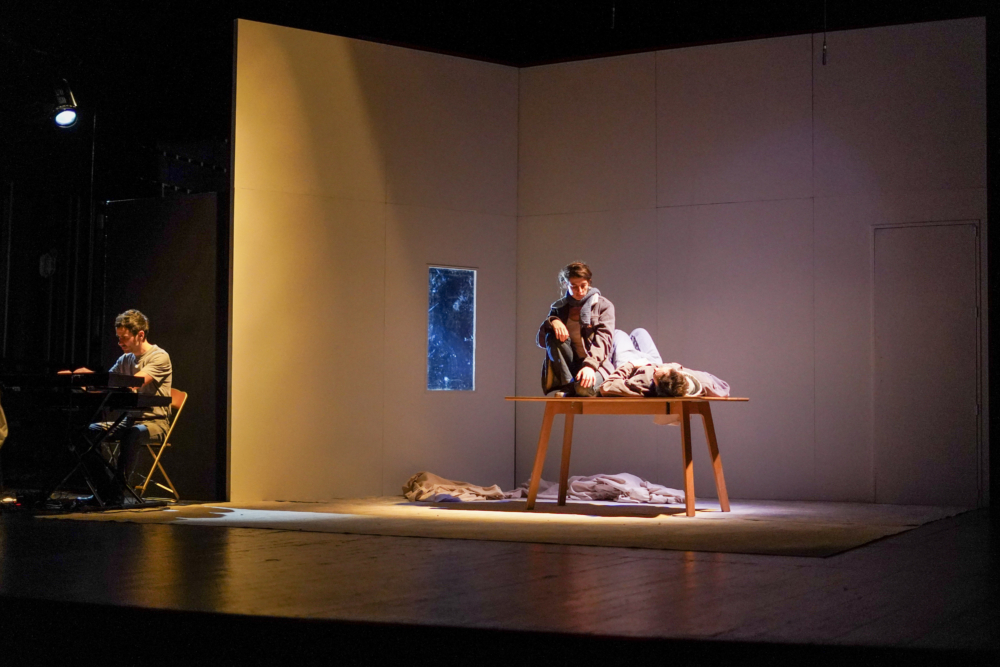 Texte et jeu ne sont que deux des trois piliers de ce spectacle créé en novembre dernier à Lisieux. Le duo d’interprètes, également metteurs en scène et auteurs de la pièce, dialogue avec Sly Apollinaire, musicien, chanteur, qui ouvre le spectacle avec un petit clavier (un farfisa) sur les genoux et constitue réellement la troisième partition de cet ensemble au synthé. Il ne ponctue pas le spectacle, comme c’est souvent le cas dans les pièces intégrant de la musique live, mais en est une figure à part entière. Multiinstrumentiste, autodidacte de pop « errante et sans âge », comme il le dit lui-même, auteur de trois albums solos depuis 2011, il s’essaie pour la première fois au théâtre, et l’ensemble est tout à fait homogène. Au point que la cinquième et dernière partie, plus courte, est un véritable échange avec lui. Désuète, cette scène est encore plus décalée que les autres, ringarde et attachante à la fois. Comme parfois peuvent l’être les situations de La Réunification des deux Corées de Joël Pommerat à laquelle cette écriture fait penser.