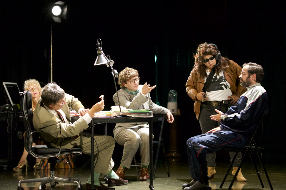 Car ce Polar(e) se balade entre parodie de série télé, d’une part, comme il en défile des milliers sur les chaînes du petit écran, où se conduisent des enquêtes policières à coups d’interrogatoires et d’analyses scientifiques, et une mise en abyme du théâtre, d’autre part, le jeune homme qui a disparu étant un jeune comédien de 17 ans et le principal suspect, un metteur en scène. Tout commence d’ailleurs avec Jean-Luc Vincent et Céline Fuhrer, qui arrivent par le haut des gradins comme un vieux couple de spectateurs qui serait en retard pour la représentation, vieux couple d’artistes qui va ensuite rejoindre la scène. Comme il aime donc à le faire, le duo multiplie à l’occasion de ces mises en abyme des critiques pleines de dérision sur le milieu, ses lieux communs et surtout la toute-puissance des metteurs en scène et les abus qu’elle produit inévitablement.