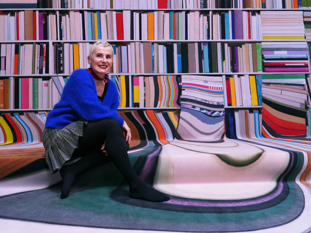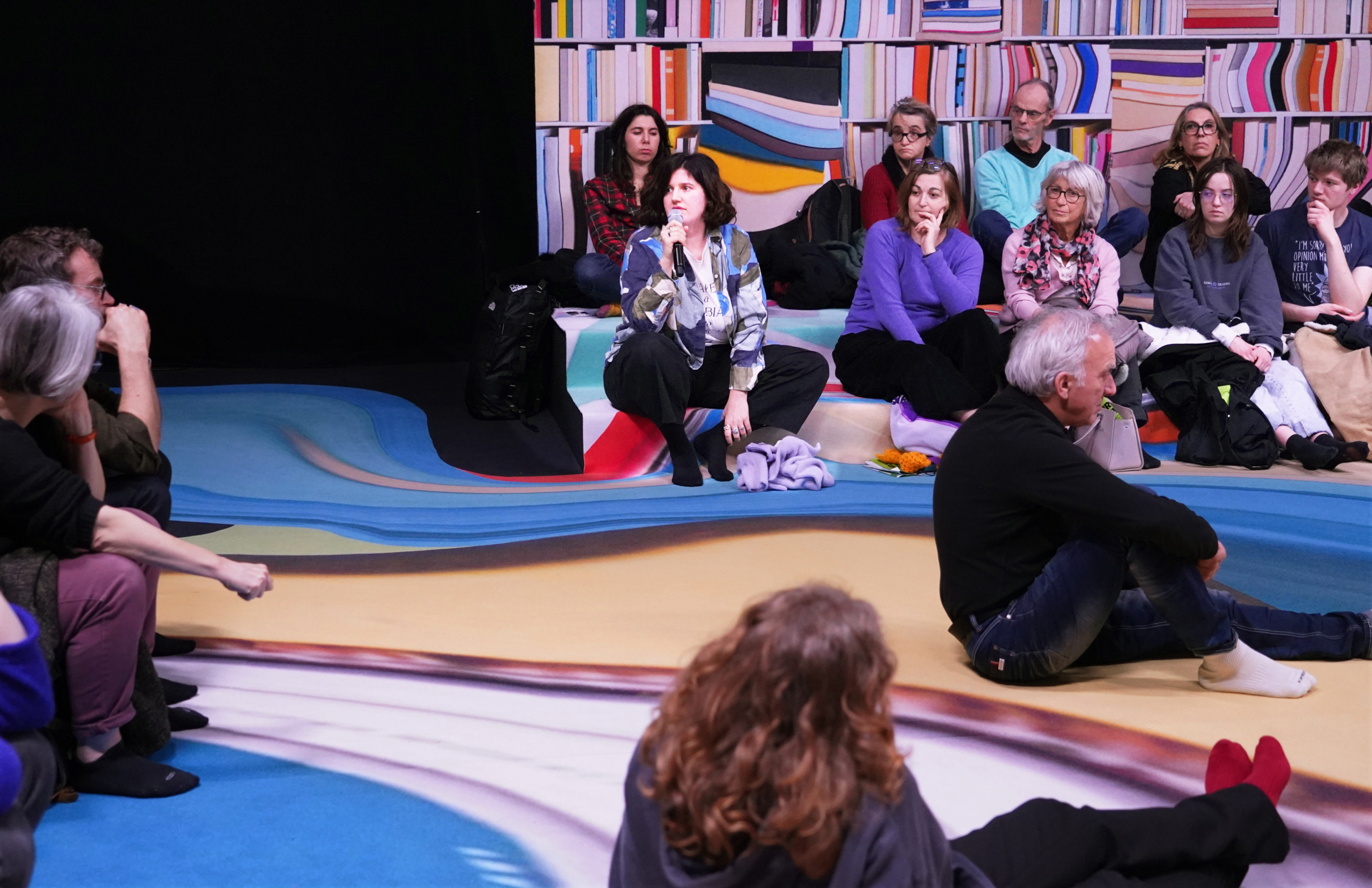 L’expérience s’apparente à une sorte de trip. L’effet d’un puissant psychotrope, genre LSD. Après avoir rangé ses chaussures dans un casier, on pénètre dans une bibliothèque. Les murs y sont tapissés de milliers de livres. On pourrait être dans le salon d’un appartement d’intellectuels bourgeois. C’est coloré. C’est vivifiant. Le public, qui, comme nous, est invité à y prendre place, s’assoit sur la moquette. Certains s’y allongent. Le problème, c’est que les livres sont en train de fondre. Sur les étagères inférieures, les ouvrages se répandent au sol, formant des flaques polychromes. Sous l’effet des projecteurs, ils changent de couleur, se mélangent. Déboussolé, on fait comme les autres ; on s’assoit, on respire un bon coup. Quand les premiers mots retentissent dans les enceintes, on tend l’oreille.