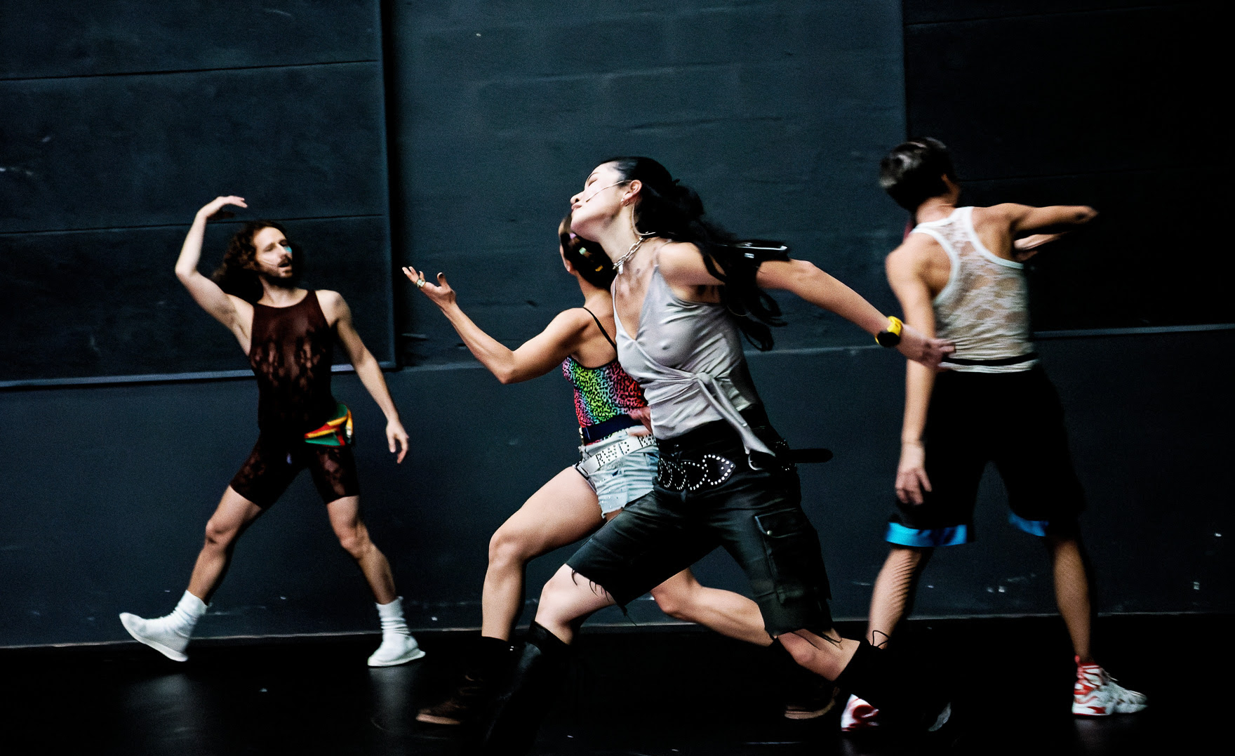 Un ballet pour Gen Z blasée et millennials au bord du burn-out ? Quatre interprètes en débardeur à motif léopard fluo ou en dentelle blanche s’avancent, pupitre noir à la main. Ils et elles commencent une conversation de sourds, où s’enchaînent frénétiquement quelques phrases : « How can it happen again and again », « What do you mean », « You know what I mean ». Du genre féru de musique, Alban Richard aime confronter sa danse à différents univers musicaux : les compositions minimalistes de Brian Eno et David Tudor dans 3 works for 12 (2021), des titres pop des années 1980 chantés par une soprano et un beat boxer dans Come kiss me now (2024). Avec Quartet, co-signé avec le musicien et DJ Simo Cell, le chorégraphe emprunte à la rhapsodie pour mettre en scène et en corps les dissonances du monde actuel.