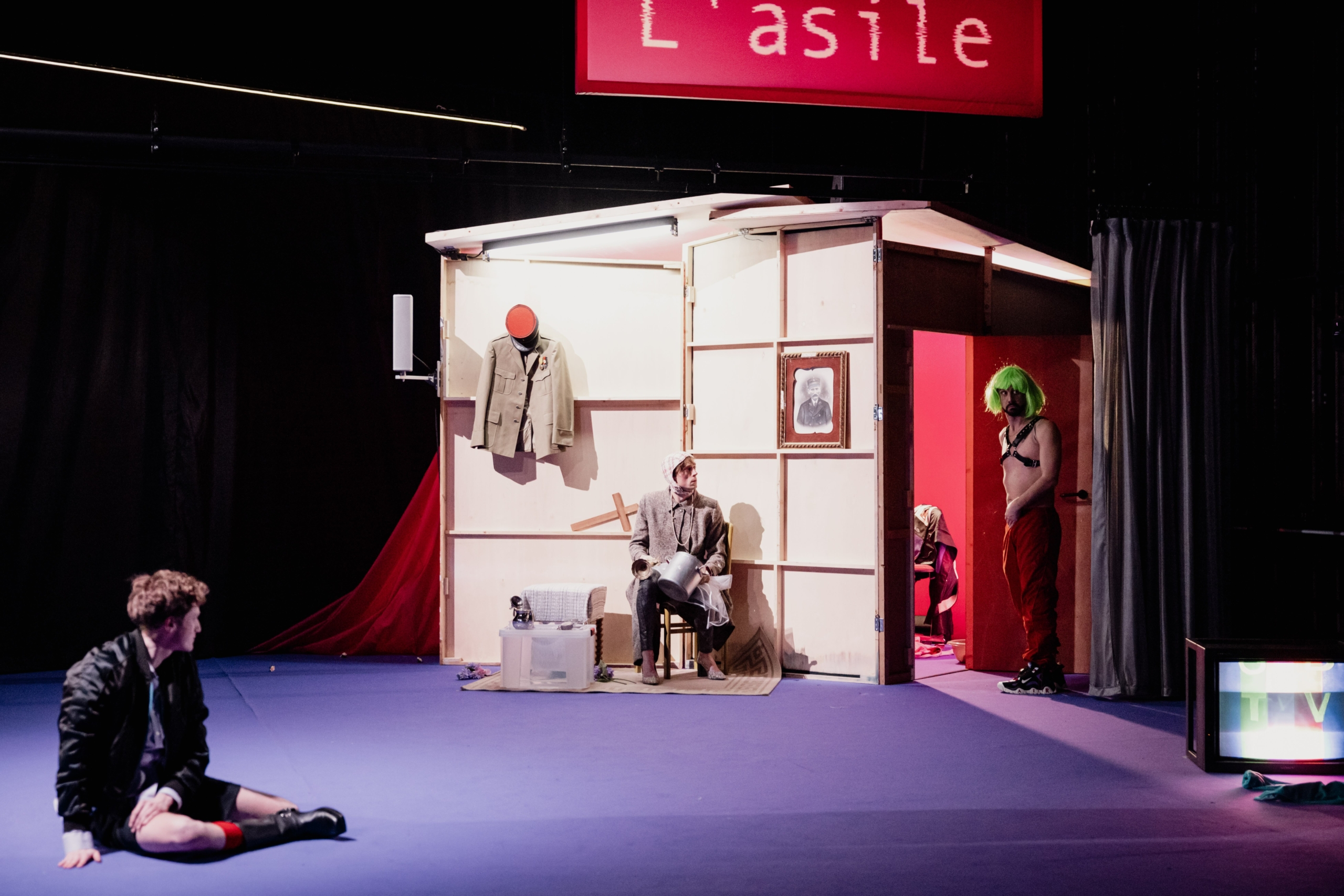 Ainsi résumée, La Mort Difficile semble se borner à cocher toutes les cases du bingo de la représentation traditionnelle de l’homosexualité, avec son lot de rejet familial, de potentiel retour dans le « droit chemin » hétérosexuel, de soirées interlopes, de passions forcément déçues à cause de garçons un peu trop épris de leur liberté, et de suicide final, dopé si possible au pathos, car les histoires d’amour gays, encore plus que les autres, finissent (très) mal en général. Reste que, s’il charrie effectivement l’ensemble de ces éléments, cet ouvrage de 1926 profite de la plume surréaliste de René Crevel qui, en regardant ses personnages en coin avec un léger sourire aux lèvres, impose une distance cruciale, et singulièrement politique. Ce décalage, Simon-Élie Galibert, dans l’adaptation resserrée qu’il propose du roman originel, ne cesse de le mettre en jeu à travers une direction d’actrices et d’acteurs – qu’Aymen Bouchou, Roman Kané, Angie Mercier et Claire Toubin suivent sans mal – à mi-chemin entre l’incarnation et le relâchement, à même de faire de ces personnages ce qu’ils sont avant tout : des figures qui valent bien davantage pour ce qu’elles représentent, et pour ce que la société a fait d’elles, que pour ce qu’elles sont réellement. Histoire d’enfoncer le clou, et c’est là son coup de génie, le metteur en scène convoque, ou plutôt invoque, en parallèle l’un des éléments parmi les plus perturbateurs de la littérature gay. Venu de l’autre bout du siècle, avec en bandoulière sa volonté, comme Crevel, de mettre un coup de pied dans la fourmilière sociale et littéraire, Guillaume Dustan s’invite à intervalles réguliers dans la danse. Enfermé dans une cabane, armé d’une caméra, il apparaît d’abord tel qu’il est resté dans de nombreuses mémoires, à travers des téléviseurs cathodiques dignes des années 1990 où il fait reluire le personnage sulfureux et provocateur qu’il s’était créé, jusqu’à subvertir le cadre romanesque dans lequel il est entré par effraction.