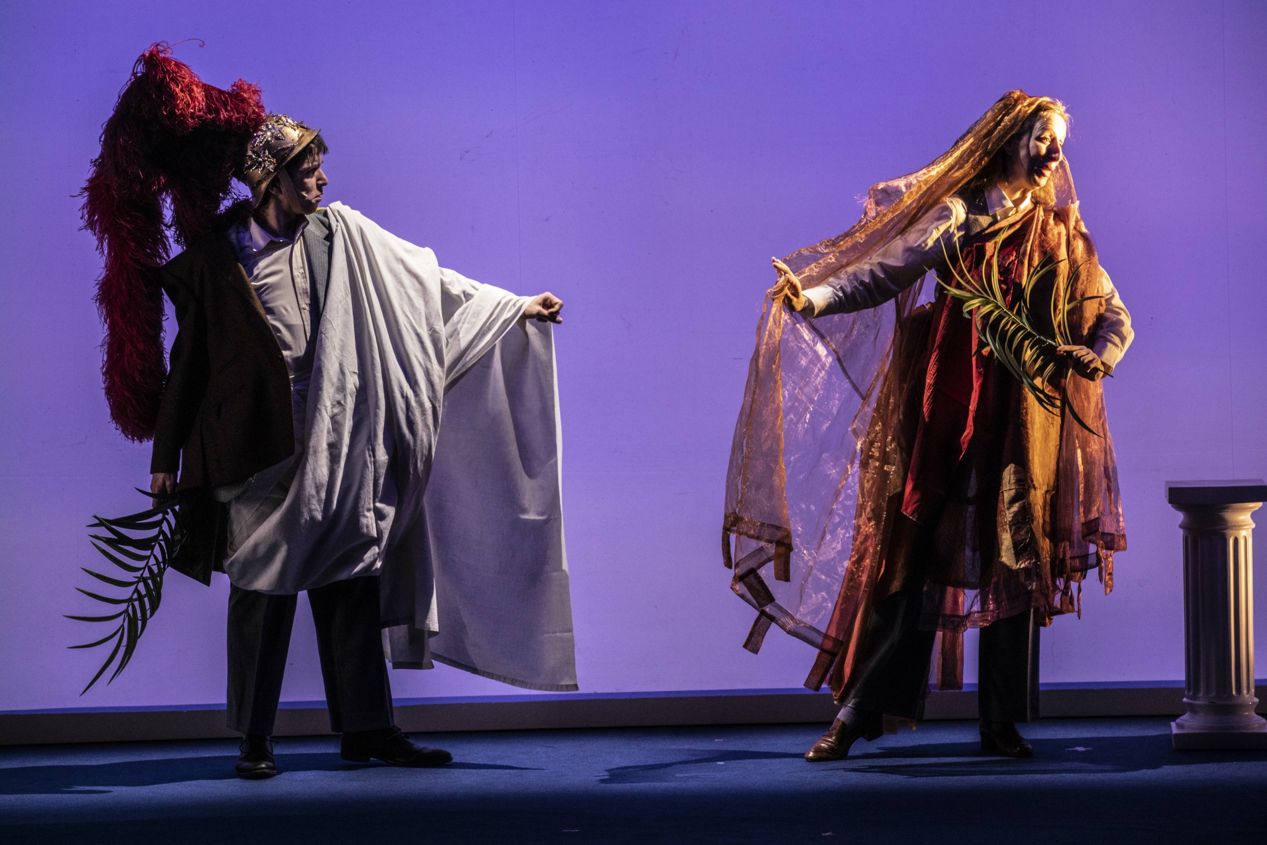 En trois actes, entre la « Télémachie » et le « Retour des fantômes », les auteurs vont surtout développer celui-ci : « Où l’on va vous conter dix années de vie et d’attente héroïque depuis la séparation jusqu’à la mort de Shoshana et où l’on en finit avec l’image éculée de Pénélope tissant et détissant son linceul dans le plus sinistre ennui. » C’est bien là que se situe tout le travail de ce duo, associé au théâtre lyonnais du Point du Jour, formé à la Comédie de Saint-Étienne et fondateur du Collectif La Lenteur, une révolution en soi dans l’époque asphyxiée par l’ultra-connexion numérique. Après Oh Johnny, plongée un peu naïve (mais pièce de sortie d’école) dans l’univers des fans, et La nuit des temps, très convaincante et évaporée recherche d’un grand-oncle disparu qui donnait le pouvoir au théâtre sur la vidéo utilisée, Pascal Cesari et Liora Jaccottet disent signer là la troisième part d’un triptyque dont on définit mal les contours tant les pièces sont disparates. L’absence les relie, certes, mais Sans Ulysse ose flirter avec l’absurde, usant des mots d’Homère, jouant de leur concomitante désuétude et intemporalité. De même avec les costumes signés Jeanne Daniel-Nguyen, oscillant entre les apparats gréco-romains et les costards et tailleurs volontiers trop cintrés et trop gris d’une époque moderne sans fantaisie. Ce qui crée le déraillement est cette mère plus joyeusement dingue que sa supposée attente le laisserait entrevoir de prime abord – elle avait même falsifié son passeport suisse en se rajeunissant de deux ans, ce qui a rendu impossible l’établissement d’un certificat de décès.