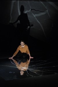 Un texte fractionné. Des phrases coupées dans leur élan par de la ponctuation. Un jeu retenu et fragmenté. Manuel Vallade digère avec lenteur les mots heurtés de David Léon. La violence de l’écriture est apaisante dans sa bouche. Il magnétise les mots. Petit à petit des découpes rectangulaires projetées sur le mur se superposent et le comédien s’avance vers le public. La scène s’éclaire et l’on découvre le sol, un miroir brisé ; éclaté comme la parole de cette famille. On perd un peu de la force du texte au bout du premier quart d’heure, la lenteur freine l’écriture, mais Hélène Soulié fait s’accélérer le rythme, et le jeu de Manuel Vallade se durcit tout comme son visage qui se transforme dans la magnifique lumière de Maurice Fouilhé.