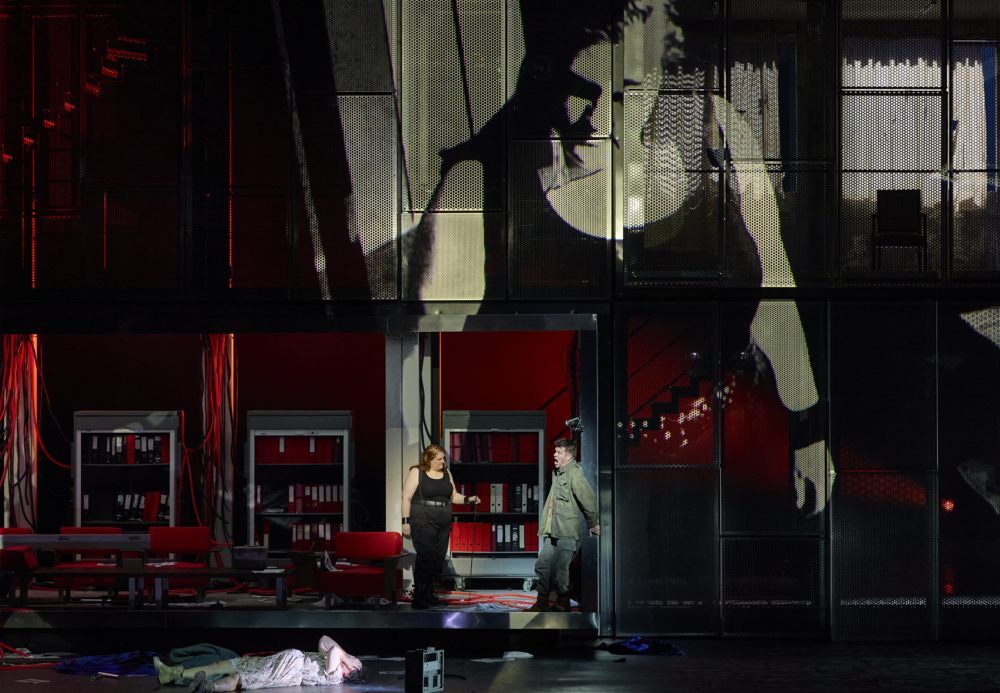 L’acte II se situe dans un bureau faisant office de salle d’archives où – comme dans L’Or du Rhin – les murs vomissent des câbles électriques dans lesquels on découvre un Wotan vampirisé. Maladivement épris de modernité high-tech, il se gargarise d’avoir acquis ou inventé un véloce chien-robot, mais se dépite de la ruine qu’est devenue son utopie délitée. Brünnhilde est d’abord présentée en fillette costumée d’une robe de princesse qui joue avec une dérisoire tête de cheval accrochée à un manche en bois. Elle va ensuite quitter le monde de l’enfance pour se métamorphoser en jeune femme affranchie, émancipée, en pantalon et débardeur, et s’autoriser à désobéir aux délires de son père. Magnifique, Tamara Wilson se montre à la fois attachante et ultra-puissante dans le rôle qui profite de son timbre juvénile comme de sa redoutable force vindicative.