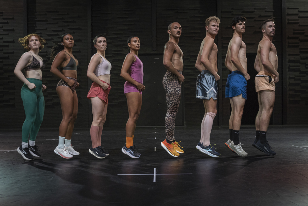 C’est ainsi annoncé dans la note d’intention : The Dog Days Are Over est « un spectacle aux allures de défi physique où l’épuisement devient une forme de vérité ». Ainsi, donc, les huit interprètes – quatre hommes et quatre femmes – vont sauter durant 70 minutes avec une pause d’une seconde à 25 minutes du début, puis une autre de quelques minutes un quart d’heure plus tard. C’est tout. Le reste du temps, ils sautent. Mais ce geste unique n’est pas la seule trame de ce spectacle. Des mouvements chorégraphiques sophistiqués, géométriques et mathématiques s’inventent à partir de ce pas rebondissant.