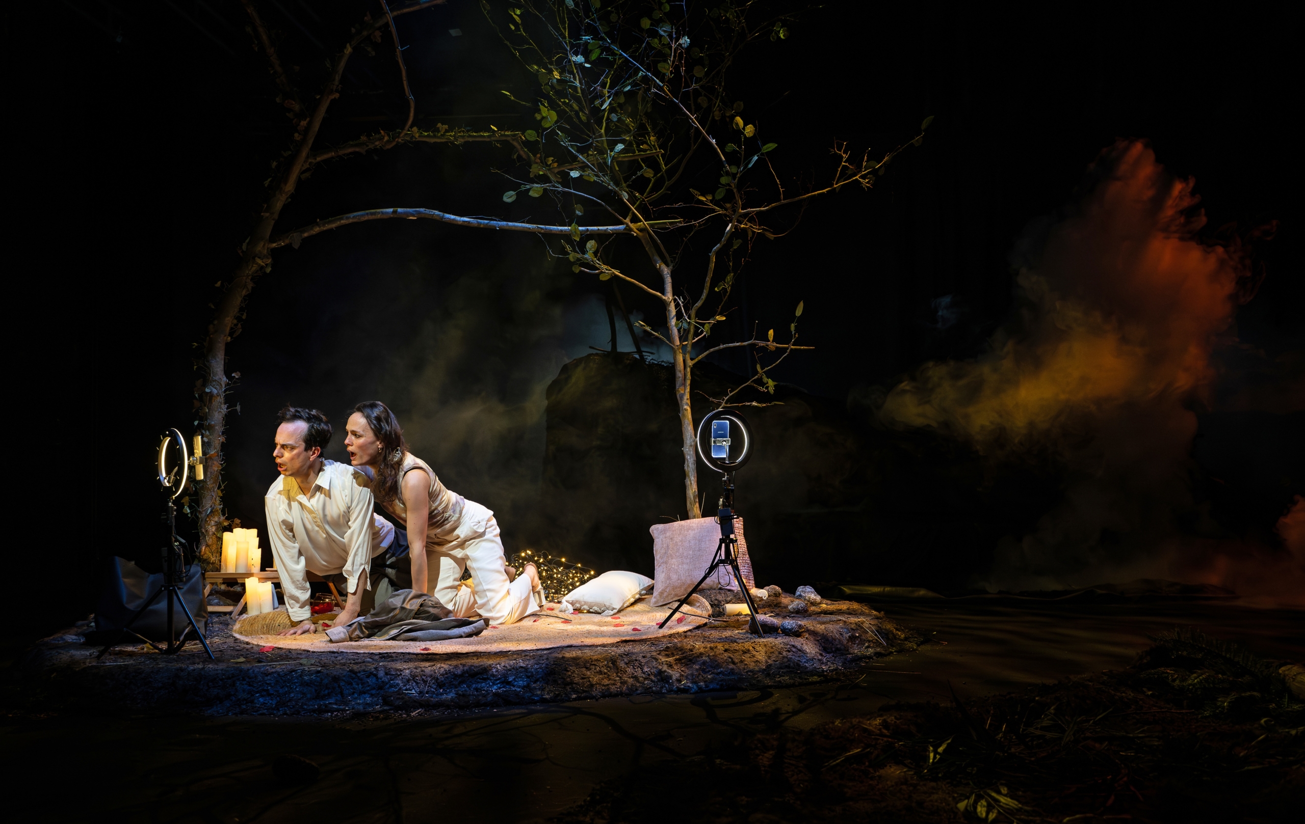 Car du stage de reconnexion avec la nature organisée au pied du seul arbre encore existant – quoi qu’assez largement moribond – à l’attention de trois sangsues humaines venues exorciser leurs addictions – aux médicaments, au numérique, à la malbouffe, à la drogue, aux fausses apparences, à l’amour… –, encouragées et stimulées par la société de consommation, à l’enterrement d’un petit chien exécuté par la fille sans coeur de sa maîtresse subclaquante et essorée par le chagrin, en passant par l’insupportable duo d’influenceurs qui, pendant qu’un incendie ravage la forêt autour d’eux et fait (littéralement) pleuvoir des oiseaux, jouent à s’aimer en singeant tous les codes du (faux) romantisme contemporain, c’est bien l’humain qui, à chaque fois, dans un élan aveugle à force d’être narcissique, se place au-dessus de la mêlée, quand bien même celle-ci serait devenue un champ de ruines. Et c’est là, à cet endroit de jonction précise entre les actions des micro-récits et leur cadre scénique, qui, parti jungle luxuriante, se dégrade chaque fois un peu plus pour atteindre le stade de pauvre monticule pollué, que la création de Still Life peut faire mouche. Dans la façon qu’elle a de montrer, sur un mode cousin du film Don’t Look Up, que l’humanité est à tel point centrée sur elle-même, et obsédée par son mal-être narcissique, qu’elle ne cherche même plus à tenter de sauver la nature, ou à faire semblant de, mais souhaite simplement tantôt être exonérée de toute responsabilité morale pour avoir la conscience tranquille, tantôt ne pas être confrontée aux conséquences de ses actes, et tantôt encore ne plus avoir à se préoccuper que de ses égoïstes turpitudes, à l’image du décès de ce chien pleuré à chaudes larmes alors que, tout autour, la désolation manifeste ne provoque aucune réaction – mise à part celle de la nature elle-même.