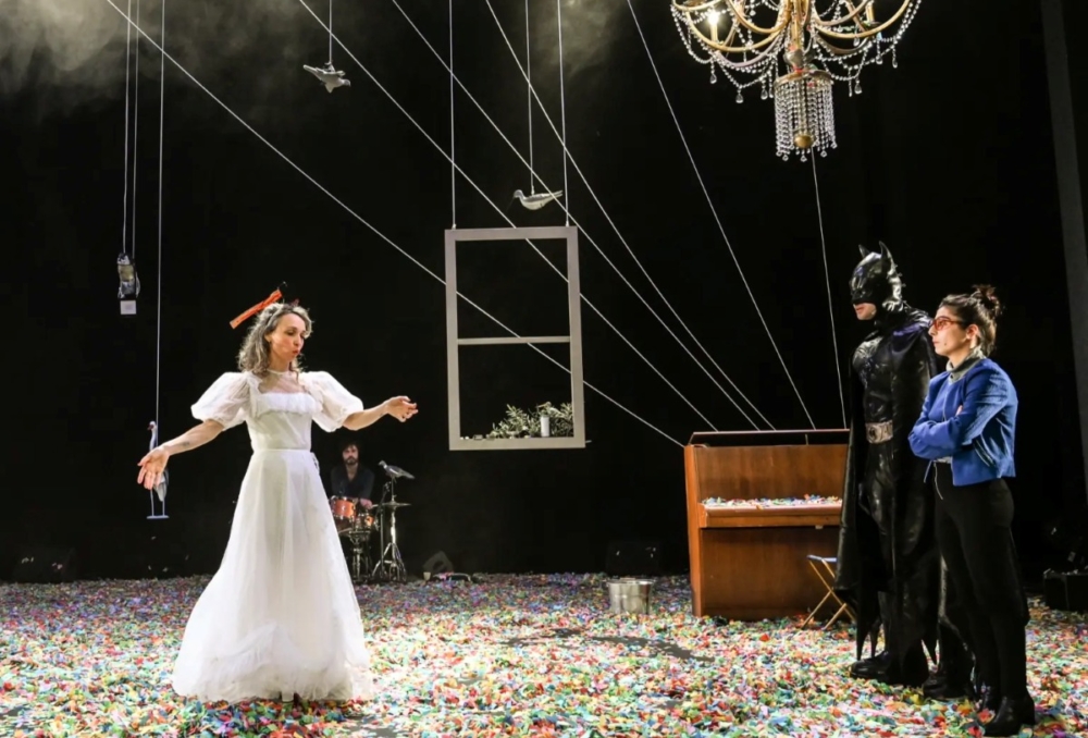 Écrite par Martin Legros, la pièce a quelque chose de l’ordre de l’entomologie des affects. La dévastation causée par la mort de l’enfant est scrupuleusement détaillée sous nos yeux, et tout nous est adressé, avec de régulières prises de parole face au public. Le choix d’une scénographie anti-naturaliste – très belle par sa composition, sa création lumières subtile, qui rappelle que la modestie n’empêche pas l’inventivité – permet de débrancher pour partie de stéréotypes qui viendraient enfermer l’histoire et les personnages. Les cotillons qui jonchent le sol, la glacière, les oiseaux factices comme reliés au piano dont on ne se sert plus depuis la mort de l’enfant – sorte de prolongement des cordes de l’instrument – composent un espace ouvrant à toutes les bourrasques, à toutes les expressions de désir, de souffrance, de refus.