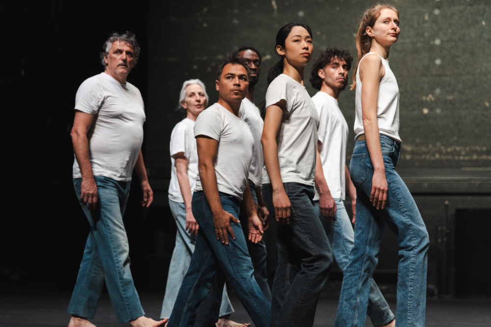 Ce qui frappe aussi, c’est le soin de la chorégraphie, ses gestes précis, froids, ses ensembles millimétrés gracieux, sans prétention virtuose. Simplicité calculée qui se reflète dans le choix des costumes : t-shirt blanc et jean. Si les lumières blanches crues teintent l’ensemble de rigidité pendant une grande partie du spectacle, les variations de lumière relâchent cette tension, apportant plus de souplesse. Sur les riffs de 7 Nation Army des White Stripes, les interprètes semblent défier la salle du regard. Ce ballet étrange de mimes, chants, danses et paroles révèle la complexité du faire ensemble, déployant une réflexion plus complexe qu’au premier abord.