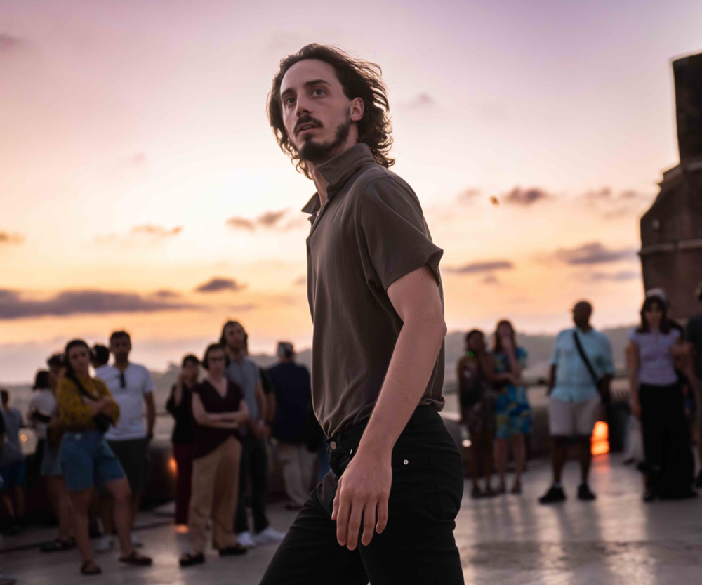 Ici l’horizon devient intime et l’exotique est au coin de la rue. Né de la collision entre la danse géographique et indisciplinée du chorégraphe italien Michele Di Stefano et les explorations sonores du compositeur Lorenzo Bianchi Hoesch, Veduta se joue dans l’espace urbain. Ni scène, ni projecteurs, mais un point de vue d’exception pour surplomber le grouillement de la ville. Muni de casques, le public est immergé dans une aura sonore qui fait de chaque souffle, chaque froissement, un murmure au creux de l’oreille tandis que l’action se déploie à perte de vue. Les interprètes s’infiltrent dans la foule, escaladent les murs, grimpent sur les toits ou surgissent d’une artère, brouillant les échelles entre le proche et le lointain. La réalité citadine se décrypte peu à peu comme une partition de signes dans laquelle le quotidien se fissure. Dans ce mixage entre les sons de la rue et des résonances venues d’ailleurs, notamment de Méditerranée, la danse fait de chaque passant·e le ou la protagoniste d’une large fiction. Une expérience de « land art chorégraphique » qui dynamite les perspectives pour recentrer l’enjeu : poétiser l’espace collectif.