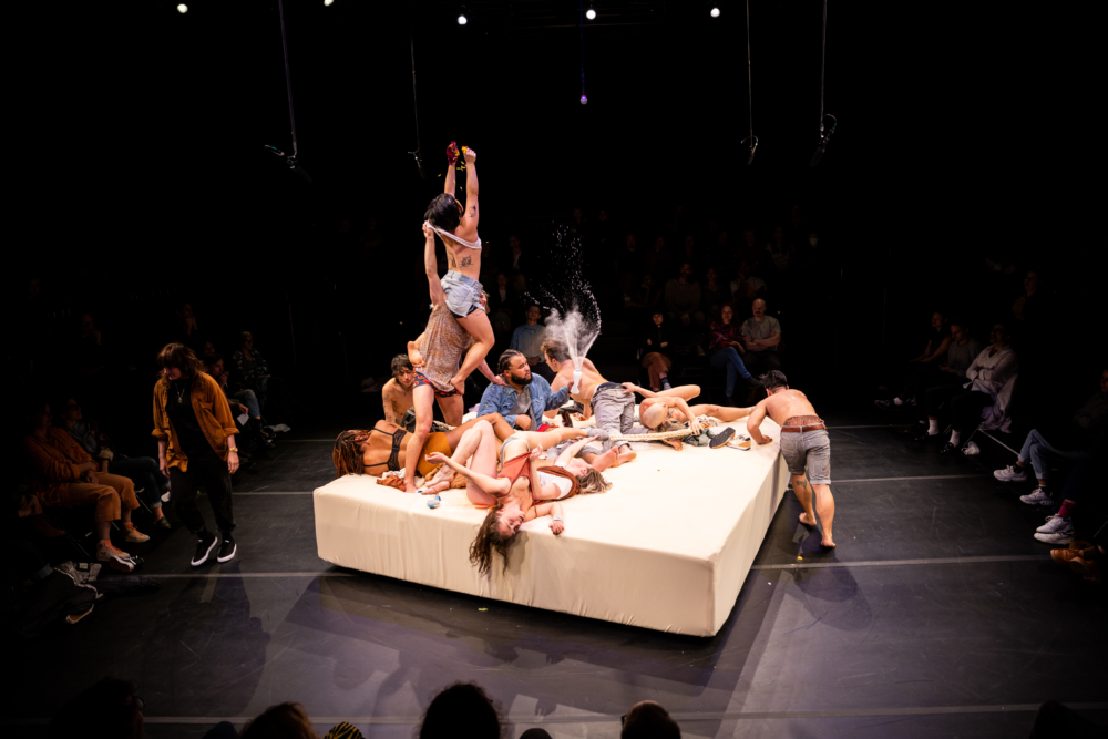 Sans crier gare, le rythme s’accélère. Les « régisseurs » se couchent sur la plateforme, l’air assoupis, en impulsant son mouvement. Les performeurs se déshabillent, le visage extatique, rappelant les représentations picturales chrétiennes des saints. Impossible de détourner le regard de ce strip-tease qui tourne désormais à mille à l’heure. Fausses larmes déposées avec une pipette, caresses furieuses et morsures ajoutent une sensualité à cette scène furieuse. Assise dans les gradins au premier rang, Faye Driscoll rejoint la scène, solidaire du groupe, pour pousser l’embarcation et enlever les objets qui fusent de tous côtés. La machine infernale s’est emballée, devenue incontrôlable. Certains tentent de se jeter dessus et de tenir, en vain. La métaphore est simple : face à l’effritement du monde, on est tous dans le même bateau. Le savoir-faire de Faye Driscoll et son habileté à entrer en empathie avec son public parviennent toutefois à rendre palpable la complexité des réflexions qui animent notre époque. Comment tenir face au chaos ? De quelles manières sommes-nous connectées au vivant et à notre environnement ? Quelles émotions et réactions produisent le délitement des écosystèmes ? Encore une fois, on n’en sort pas indemne.